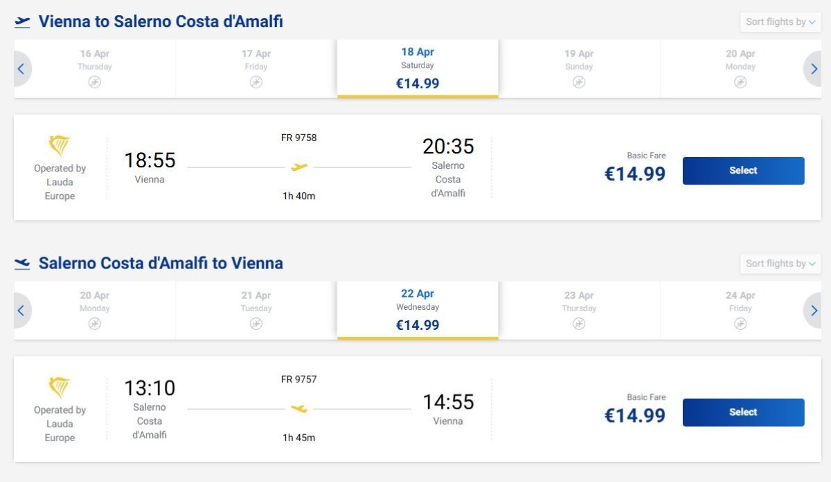 For a few last minute dates in April, get return tickets with Ryanair to Salerno Airport. The airport is a great base for travelling along the Amalfi Coast.