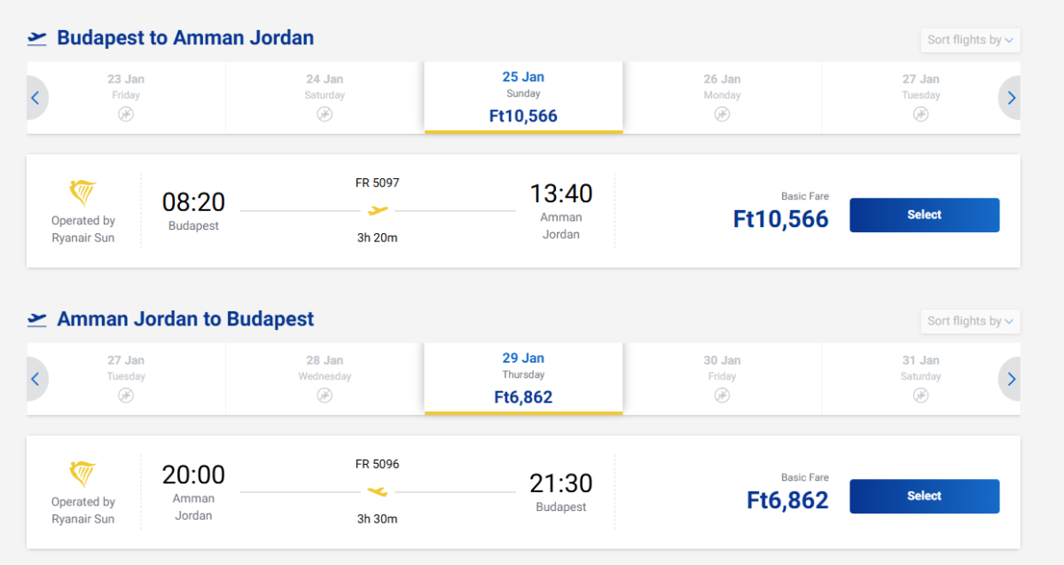 Low-cost airline Ryanair offers cheap return tickets from Budapest to Amman. The most interesting is the date 25-29 January, ideal for a five-day trip, for the price of 17 428 HUF.