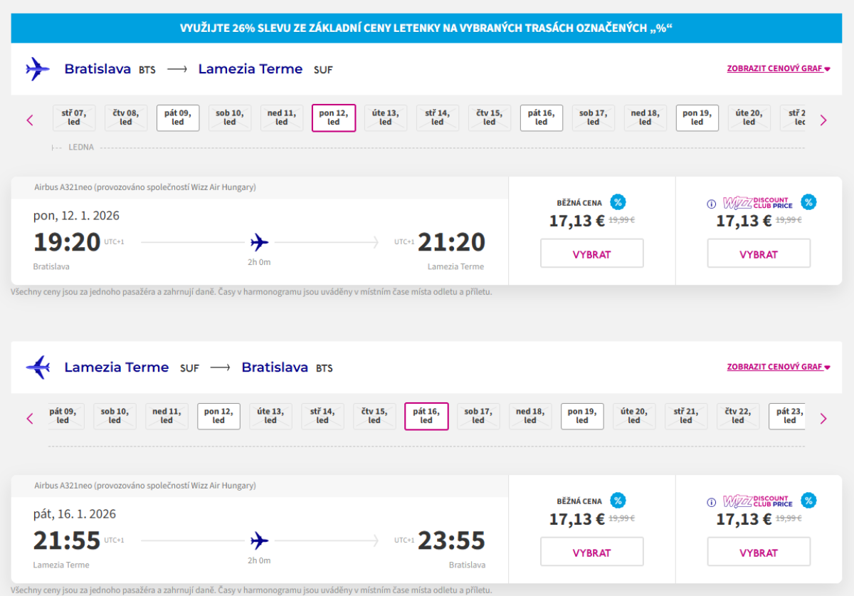 Flights are on Mondays and Fridays. Departure from Bratislava is at 19:20, return flight from Lamezia Terme leaves at 21:55.