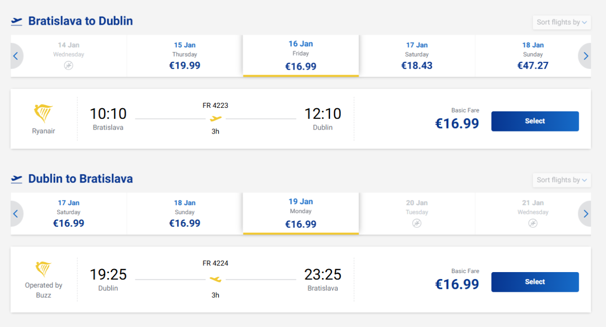 The Saturday-Monday option departs from Košice at 6:00 am and returns from Dublin at 7:25 pm.