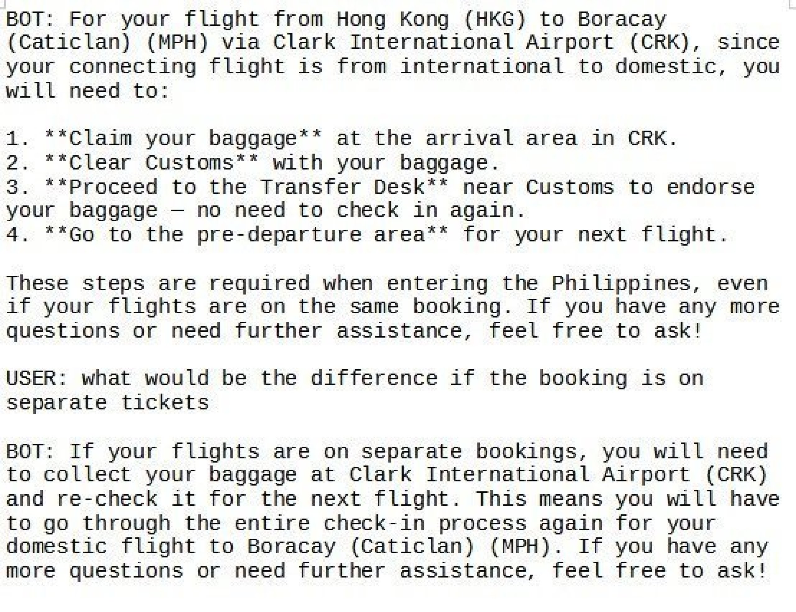 Hi, I asked something similar on the chat, I'm flying in February. My flights are on one booking and to avoid Manila I'm flying via Clark with a 3 hour layover. I will check in online. I saved the transcript of the chat with the BOT, attached.