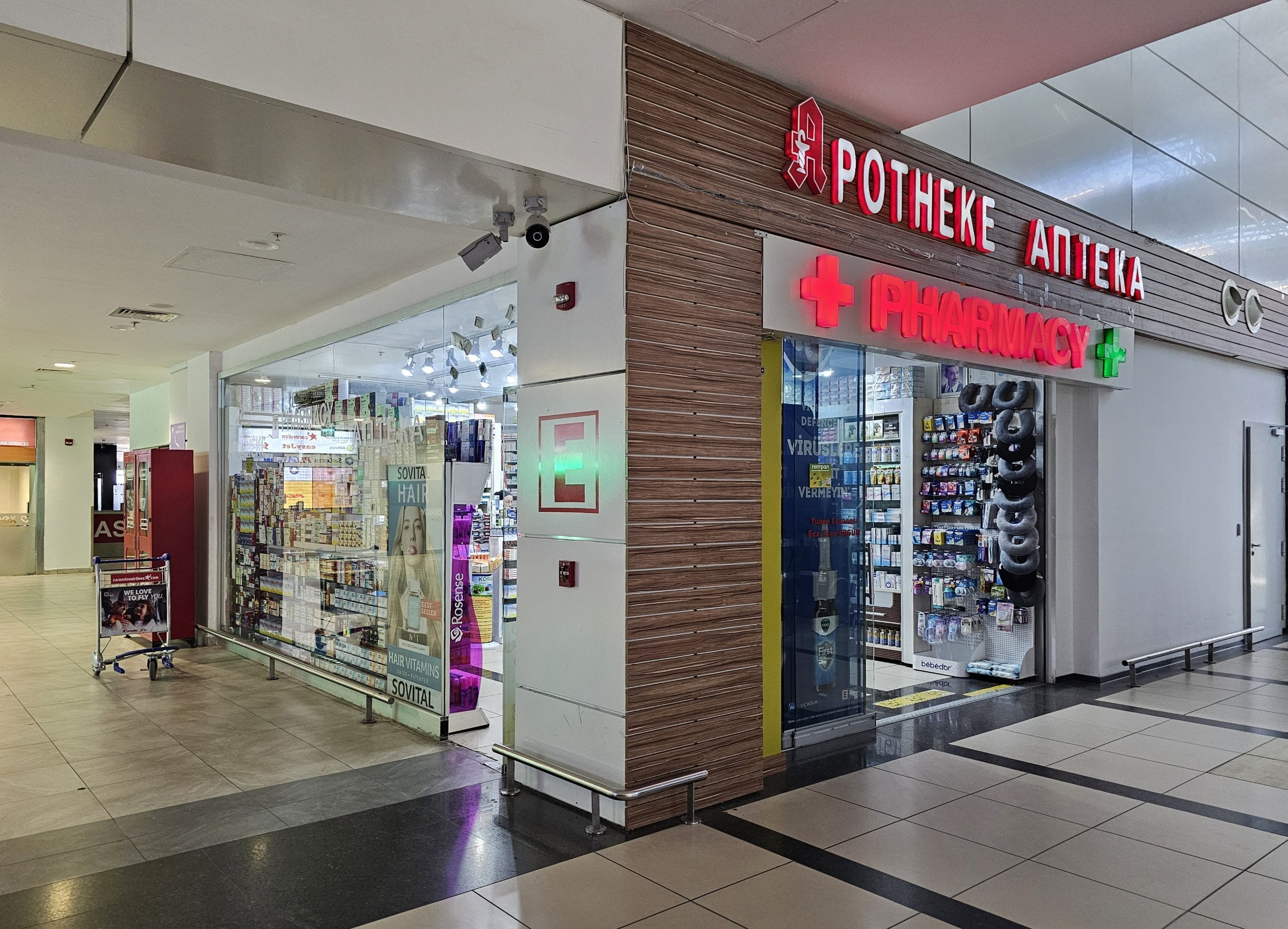 Pharmacies can be found in the public areas of both terminals (open 24/7 in Terminal 1, open 9:00-18:00 in Terminal 2).