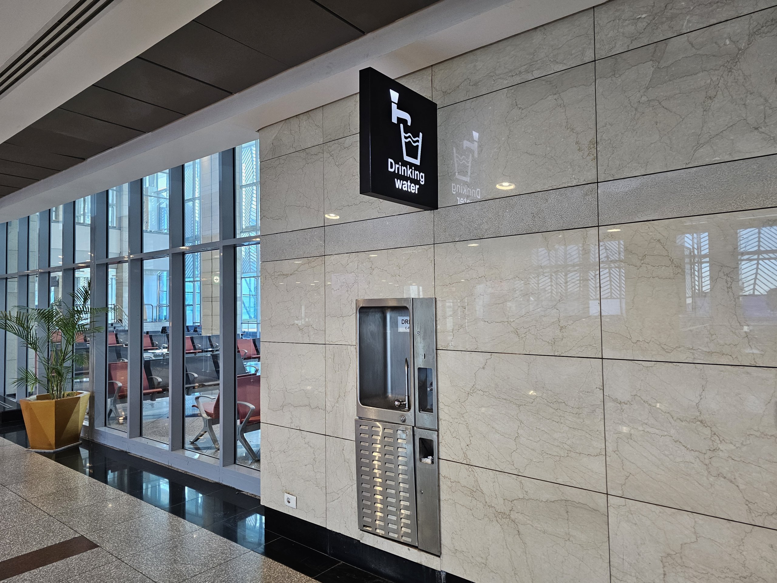 Drinking water fountains are located in many places in the public and transit areas of all terminals.