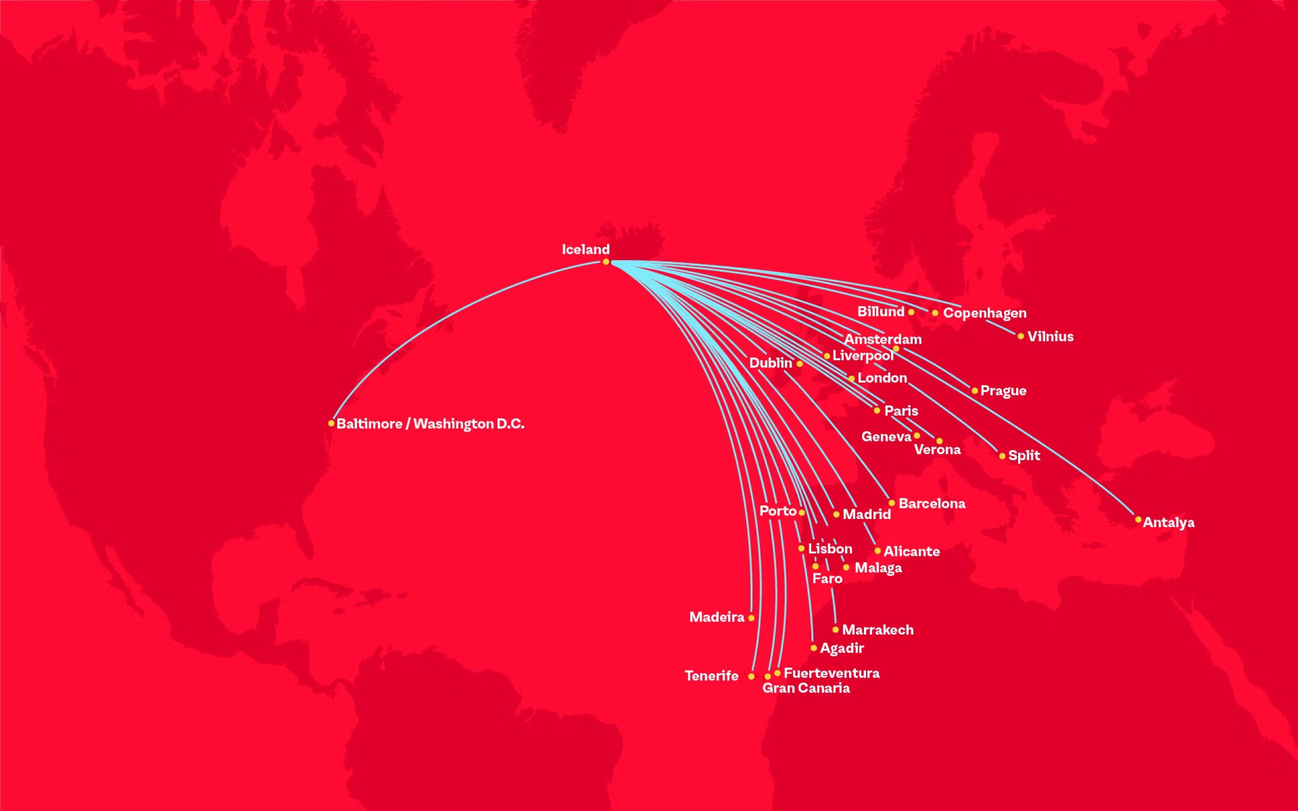 Flights to North America were gradually phased out, focusing on transporting Icelanders to seaside holiday destinations and also on routes with the opposite potential - bringing tourists to Iceland. For example, routes from Prague PRG, Warsaw WAW, London STN, Vilnius VNO or Paris CDG were popular.