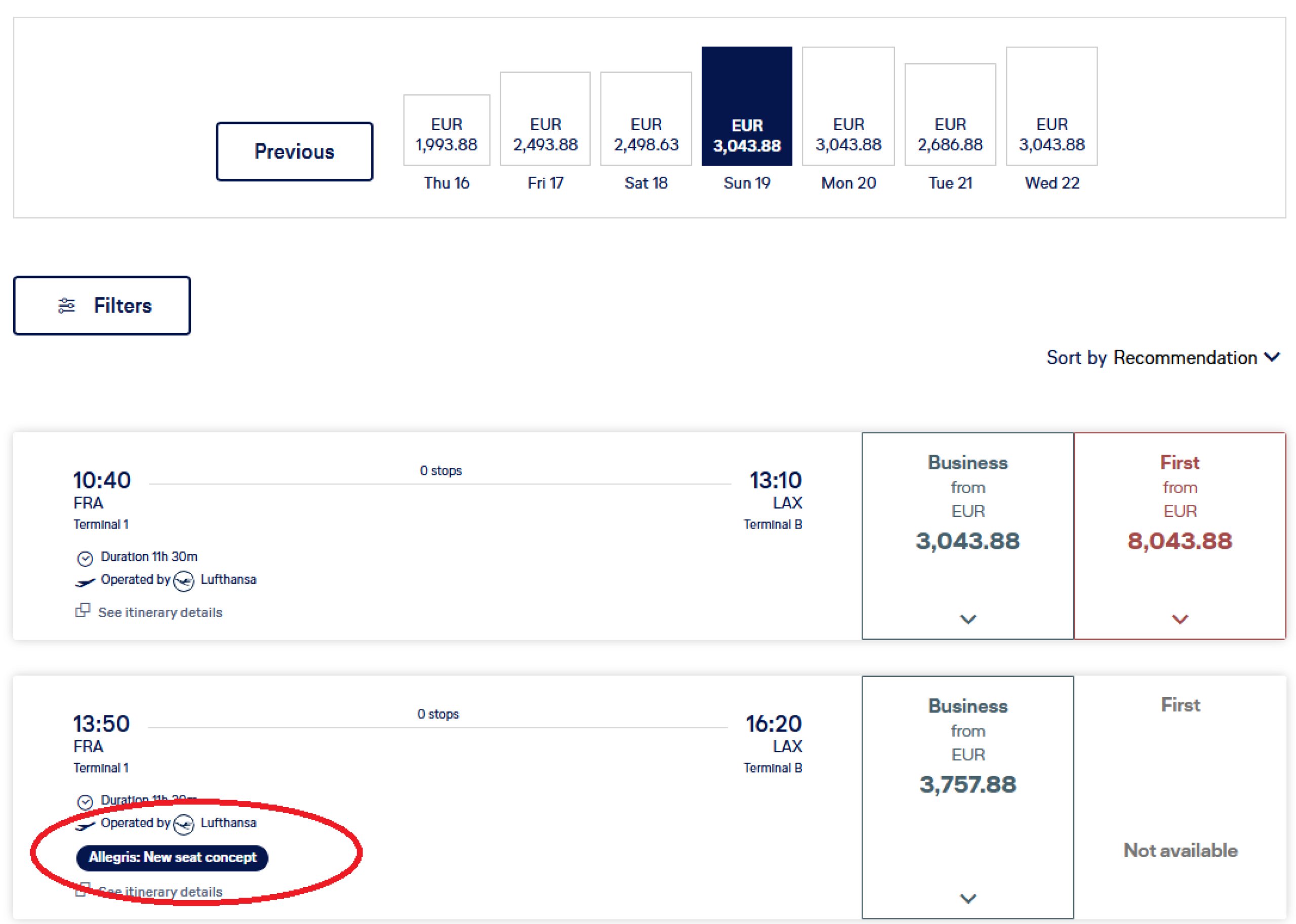 It is always important to choose a specific flight number. On some routes (for example Frankfurt - Los Angeles) there are several flights per day, but only one of them is equipped with Allegris seats.