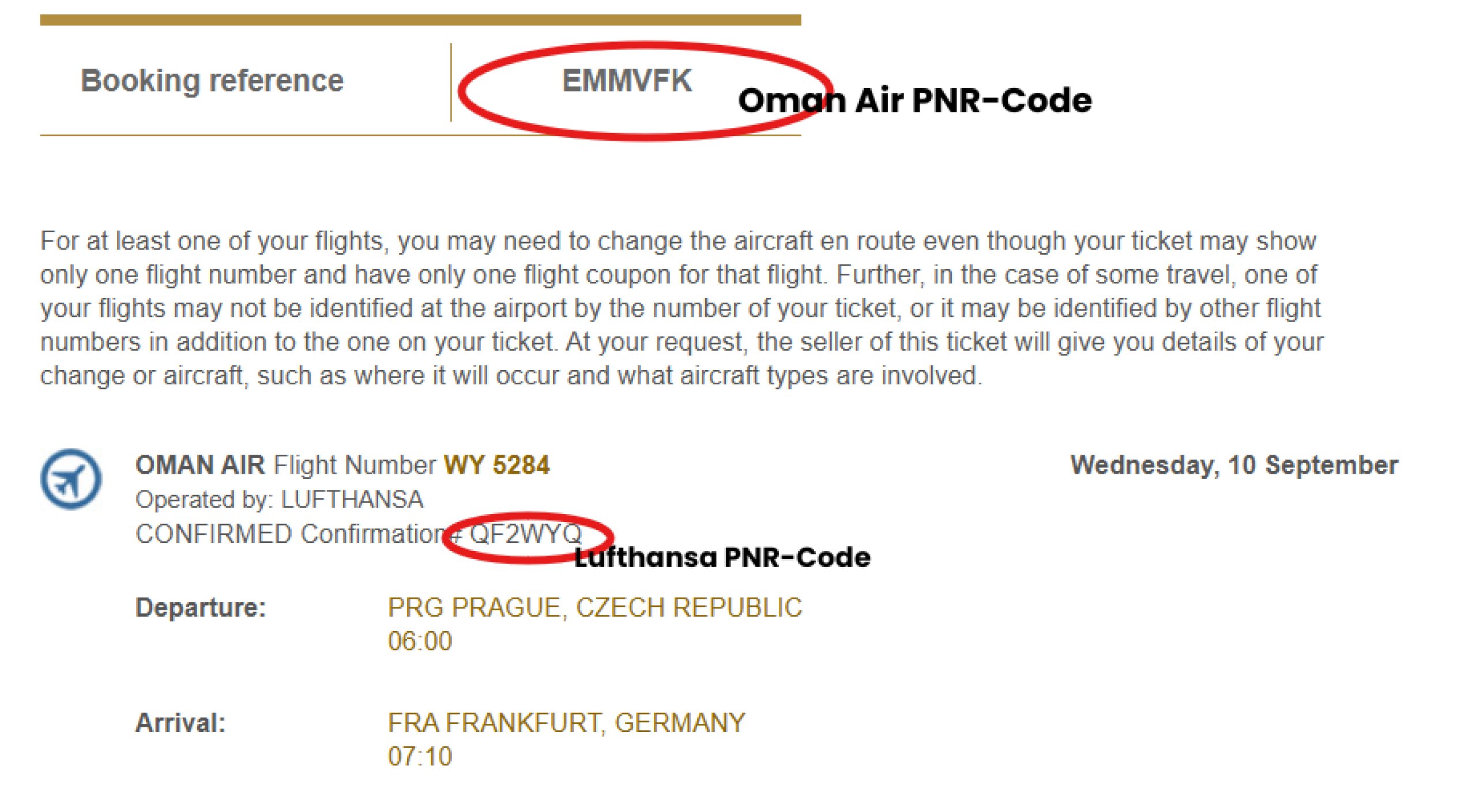All flights were purchased as one booking, yet the Lufthansa flight from Prague to Frankfurt had a different PNR code than the Oman Air flight from Frankfurt FRA via Muscat MCT to Zanzibar ZNZ.