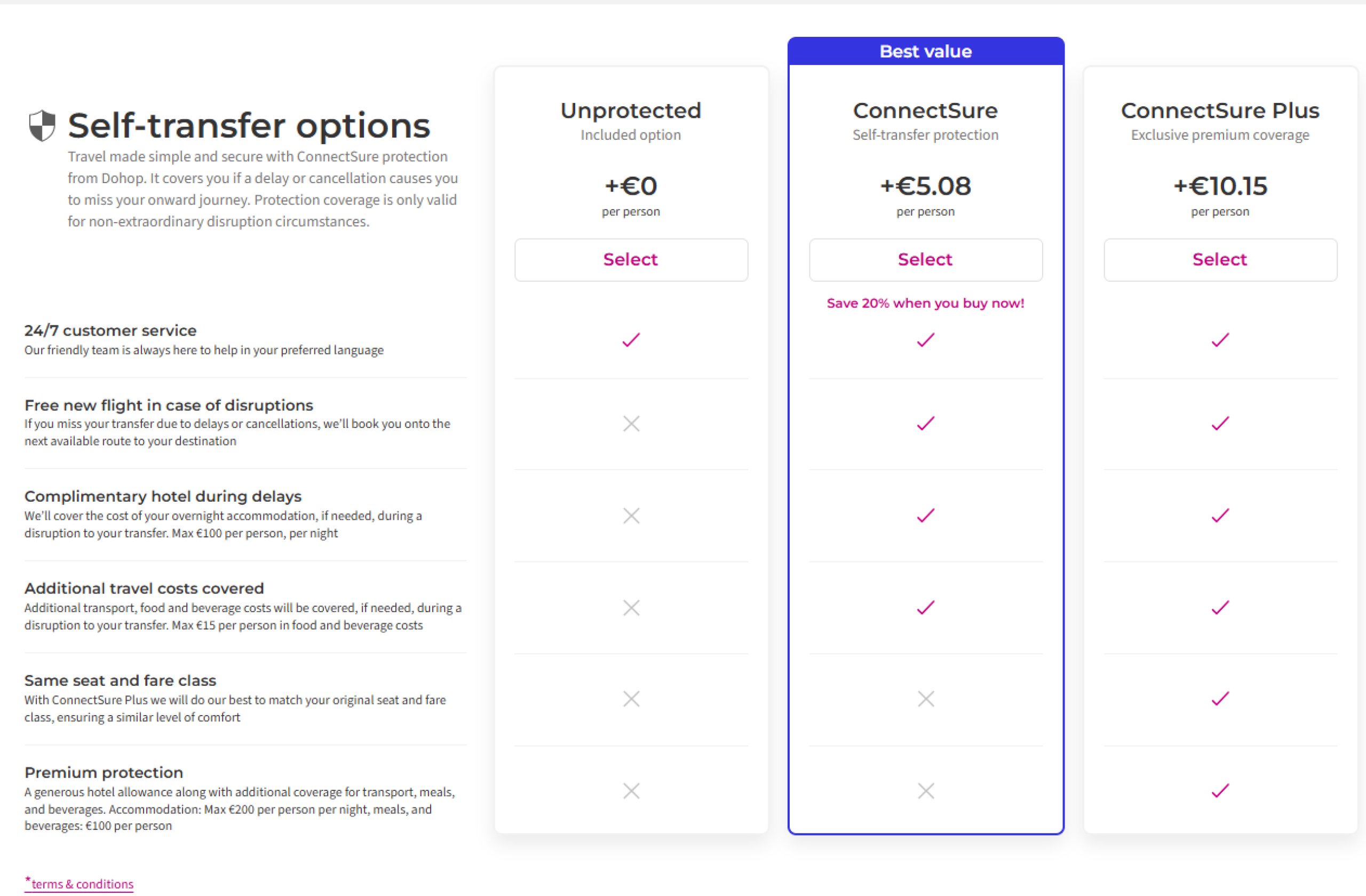 If you want to have a guaranteed connecting flight, you must also purchase ConnectSure together with your tickets, which is selected during the flight booking process.