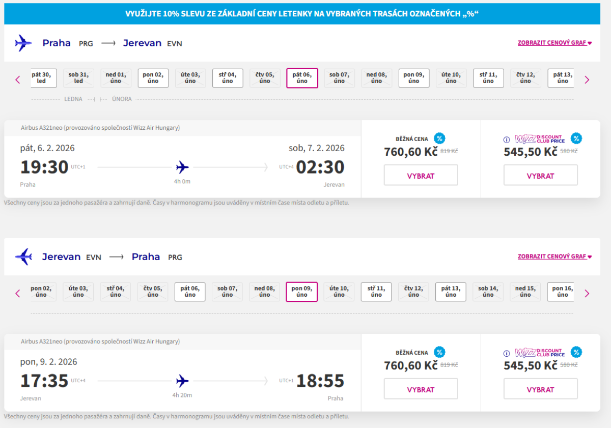 Head to Yerevan with Wizz Air in the winter months. Cheap return tickets are available from Prague and Bratislava for a range of winter dates from January to March.