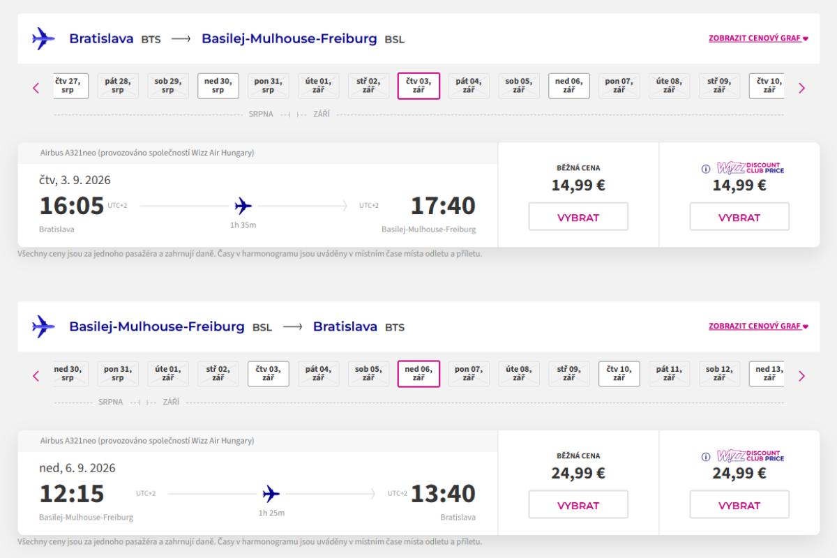 Wizz Air is offering flights from Bratislava to Basel for the long period from May to March 2027 at great prices. Return tickets start at 39 eur and works out well for long weekends from Thursday to Sunday.