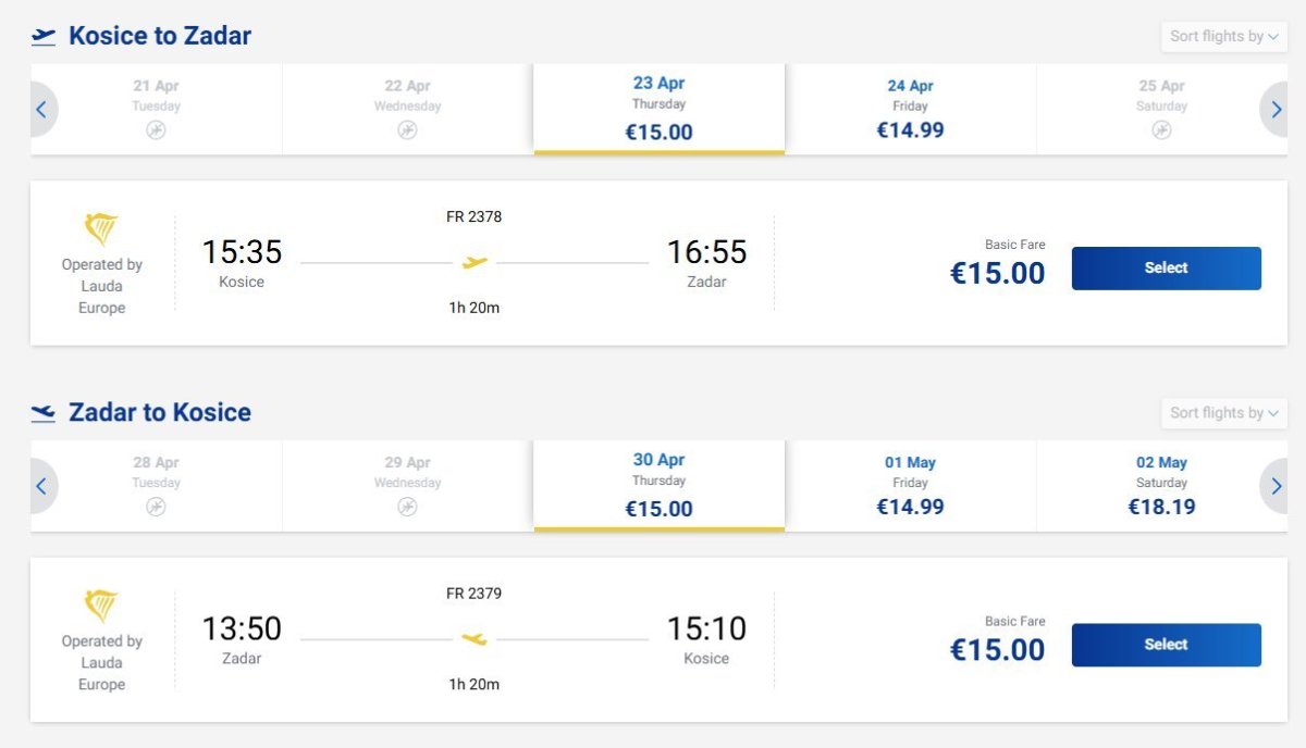 For example, the dates from Thursday to Thursday, when you don't have to deal with getting up early, are a good deal - departure from Košice is at 15:35 and return departure from Zadar at 13:50.