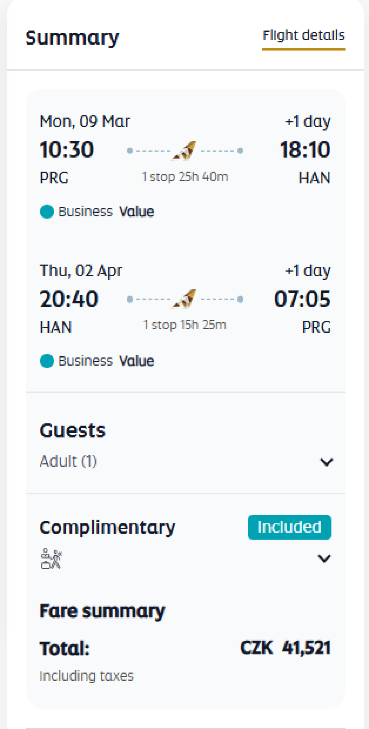 For the price of 1714 eur you can get return tickets from Prague on a Business Value fare, which includes full in-flight services but does not include a lounge visit or seat selection.
