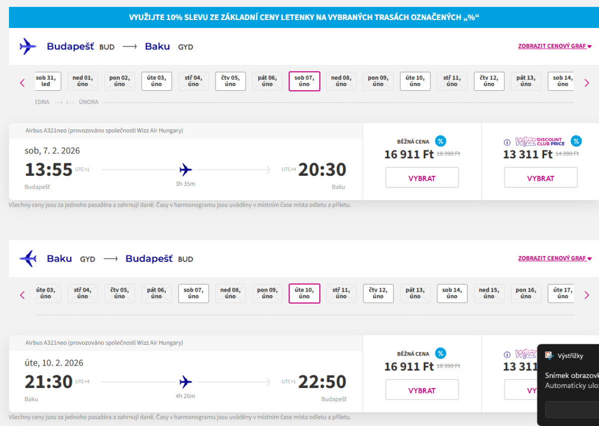 Return tickets cost 33 822 huf, with a Wizz Discount Club membership for 26 622 huf. Dates are available from January to March and shorter stays are also available, for example from Saturday to Tuesday.