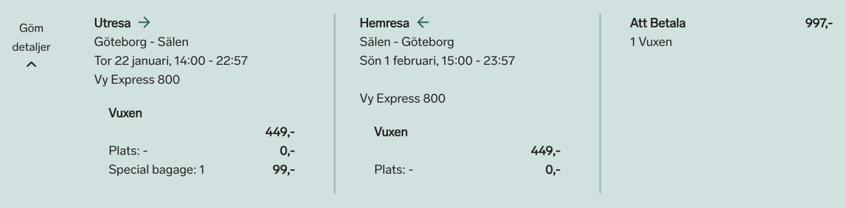 One-way tickets cost 449 sek and can be purchased directly from the website bus4you.se. The price includes hand luggage and a 25 kg suitcase. Transporting a ski bag costs 99 sek.