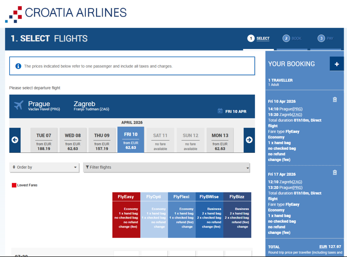 In addition, a number of dates work out very well for long weekends. For example, on the connection to Zagreb, you can fly out of Prague at 14:10 on Friday and return from Zagreb at 12:10 on Monday, making it an ideal option for a short but relaxing weekend trip.