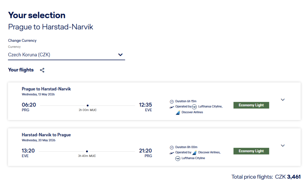 Return tickets from Prague to Harstad-Narvik Airport during May and early June for 142 eur.