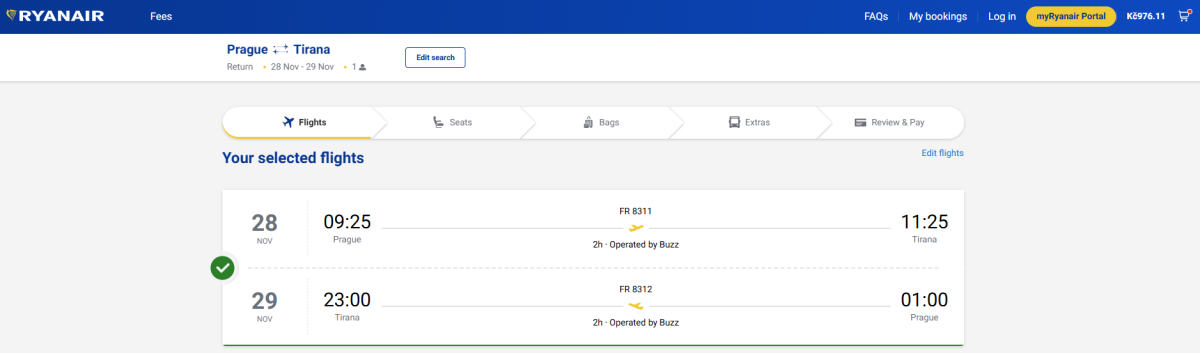 Ryanair offers a short trip to Tirana in November with ideal timing - departure from Prague on Friday at 9:25 and return from Tirana on Saturday at 23:00.