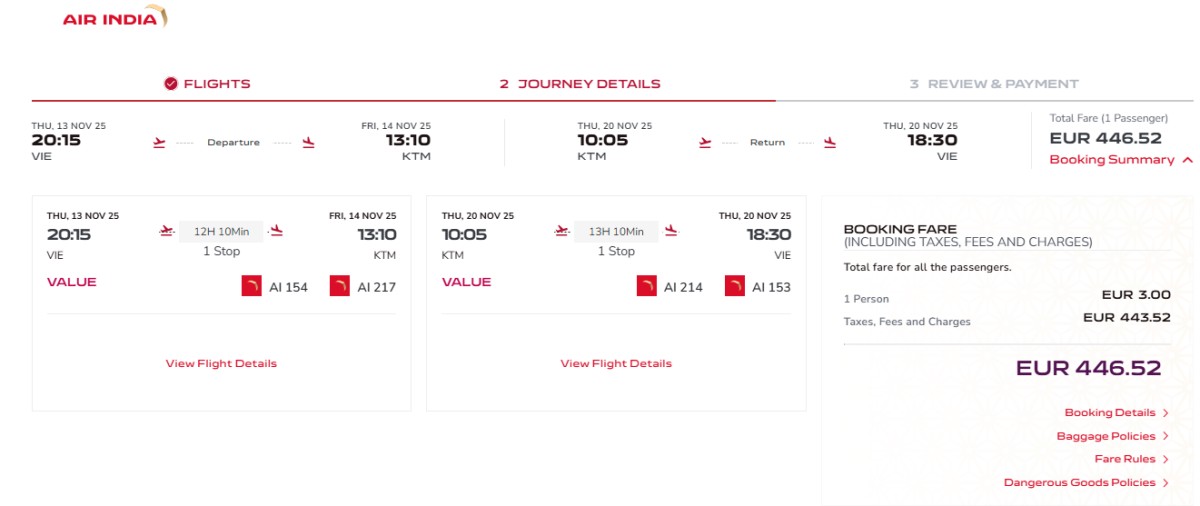 Air India offers return tickets from Vienna to Kathmandu with a short connection in Delhi from 447 eur.