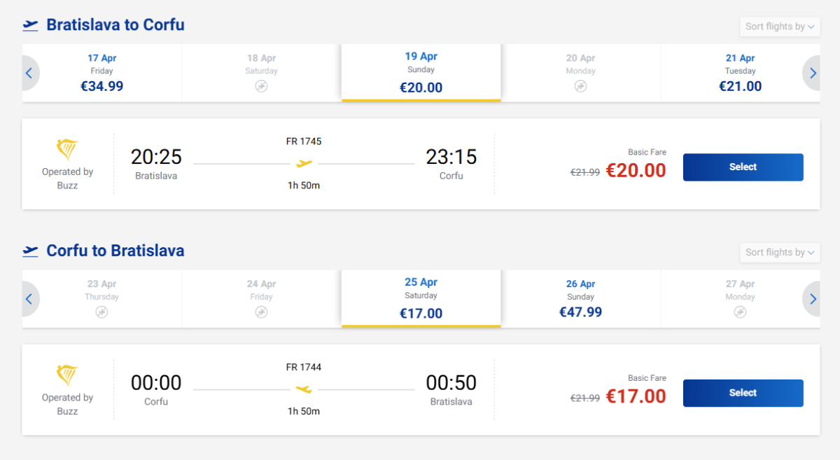 The airline Ryanair has already sold tickets for its seasonal route from Bratislava to Corfu, Greece, which will operate from the end of March. Currently, the cheapest return tickets are available mainly for April.