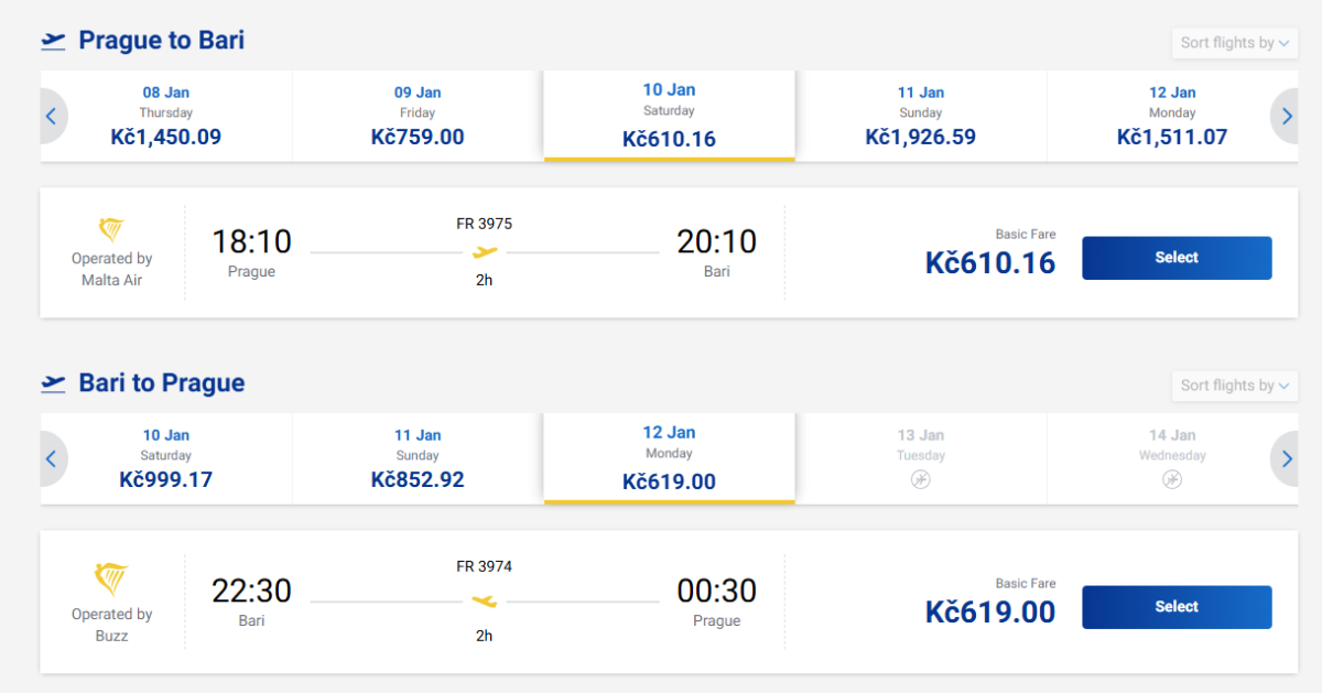 Departures from Prague are on Friday at 8:50 or Saturday at 18:10, and departures from Bari on Monday at 22:30.