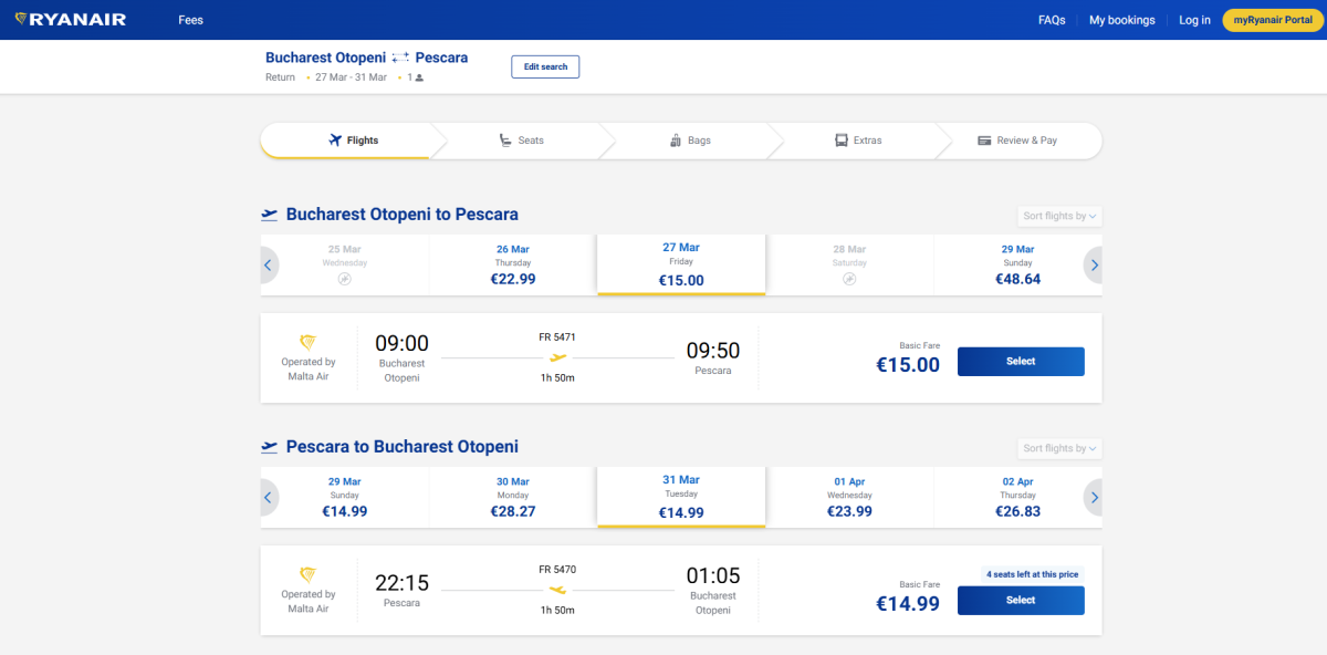 During spring, you can get cheap return tickets from Bucharest to Pescara, Italy, with Ryanair. The cheapest dates start at 30 eur for a return flight and are ideal for long weekends.