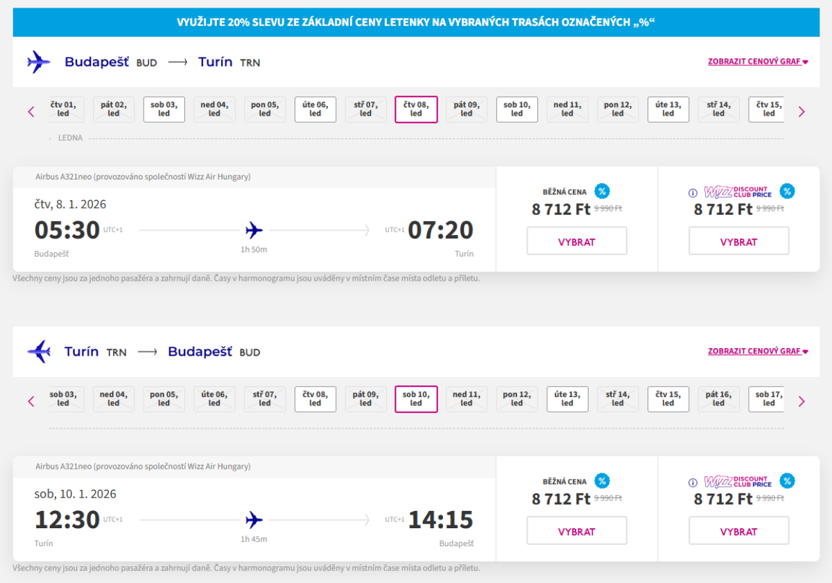 The cheapest return tickets are available from 8 - 10 January for 17 424 huf.