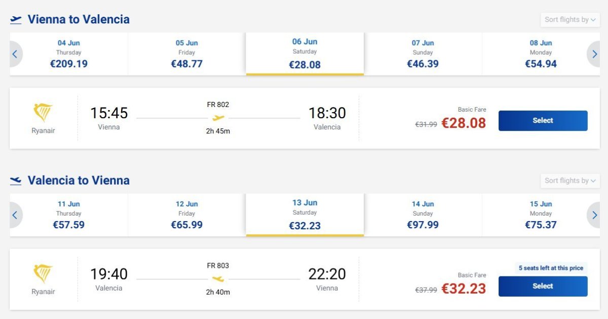 With Ryanair you can currently get the cheapest flights for a week's stay from Saturday to Saturday from 6-13 June for 60 eur.