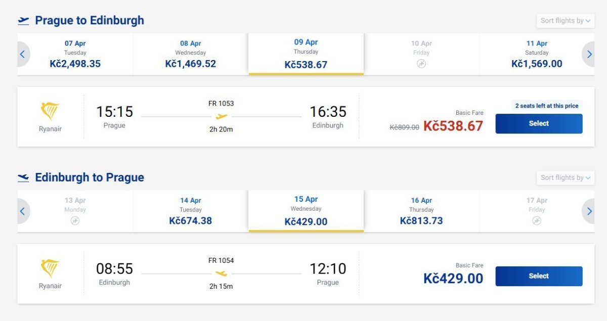 Ryanair offers last minute flight from Prague to Edinburgh for 39 eur9-15 April.