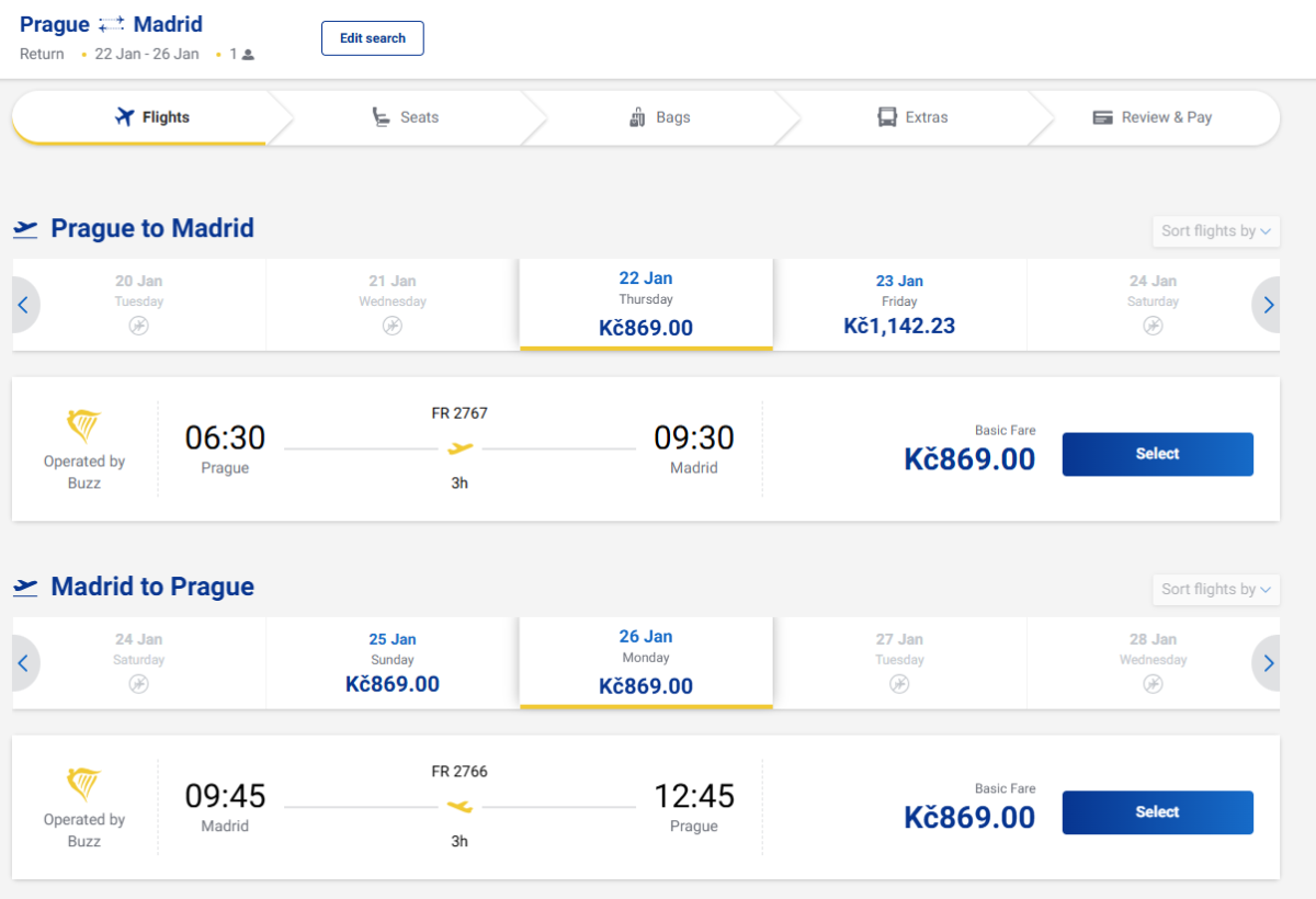 After a long time, there are some good deals on flights to Madrid with Ryanair. The best date is 22-25 January (Thursday-Sunday), when you can buy return tickets from Prague for 71 eur.