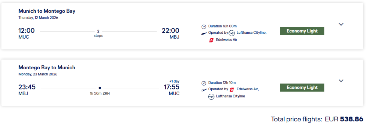 For several dates in March, you can buy return tickets from Munich to the largest resort of Montego Bay via swiss.com for 539 eur.