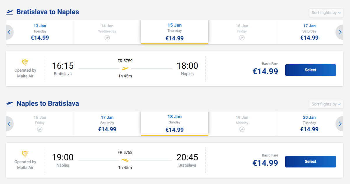 Low-cost airline Ryanair is currently offering cheap return tickets from Bratislava to Naples for 30 eur. Dates are available throughout January and flights operate regularly on Tuesdays, Thursdays, Saturdays and Sundays.