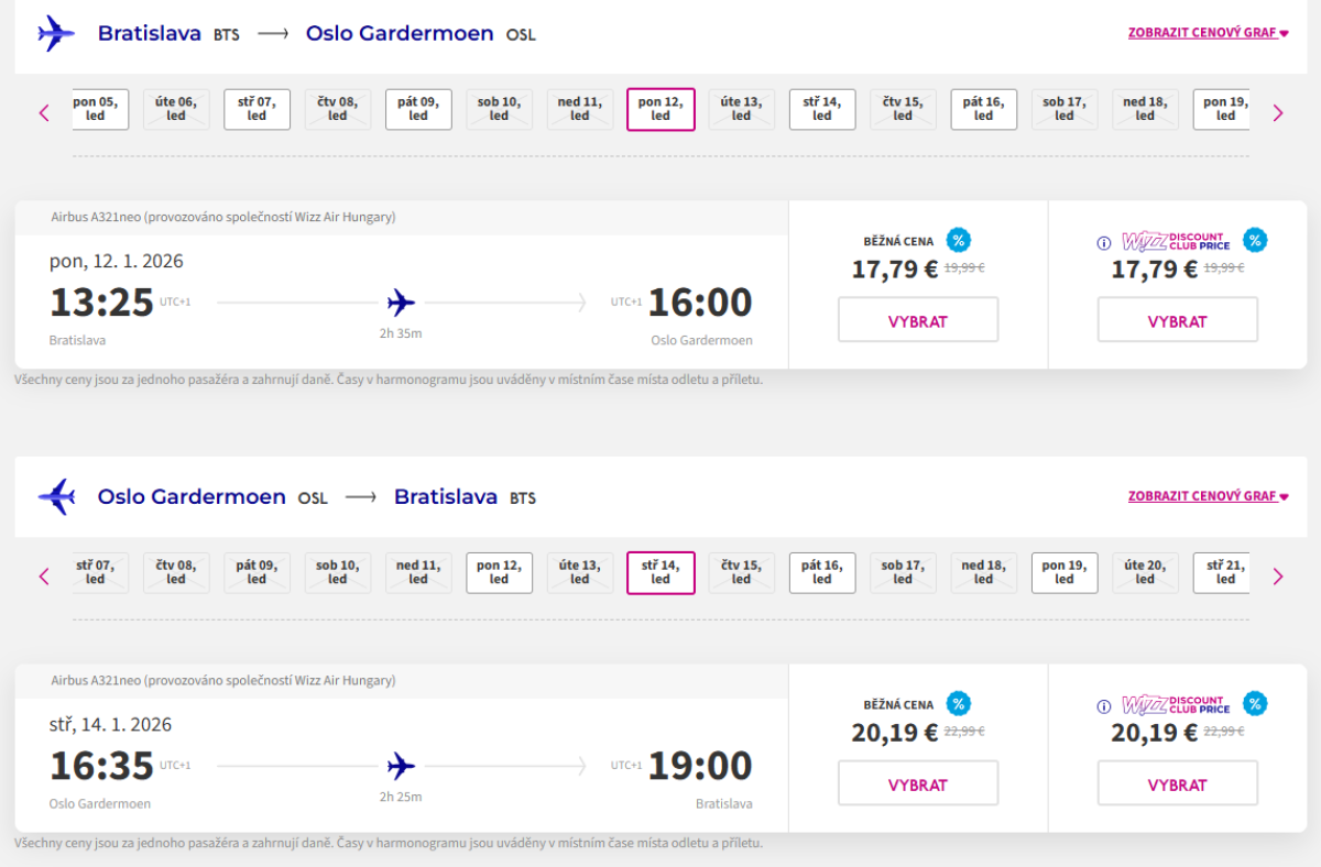 There are short breaks suitable for a quick trip, for example Monday-Wednesday or Wednesday-Friday, with departures from Bratislava at 13:25 and returns from Oslo at 16:35.