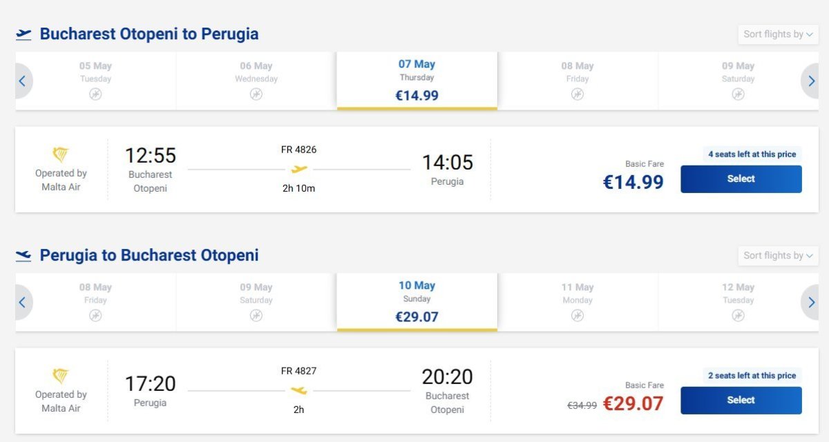 Departure from Bucharest is on Thursday at 12:55, and the return flight from Perugia is on Sunday at 17:20, so no early morning wake-ups.