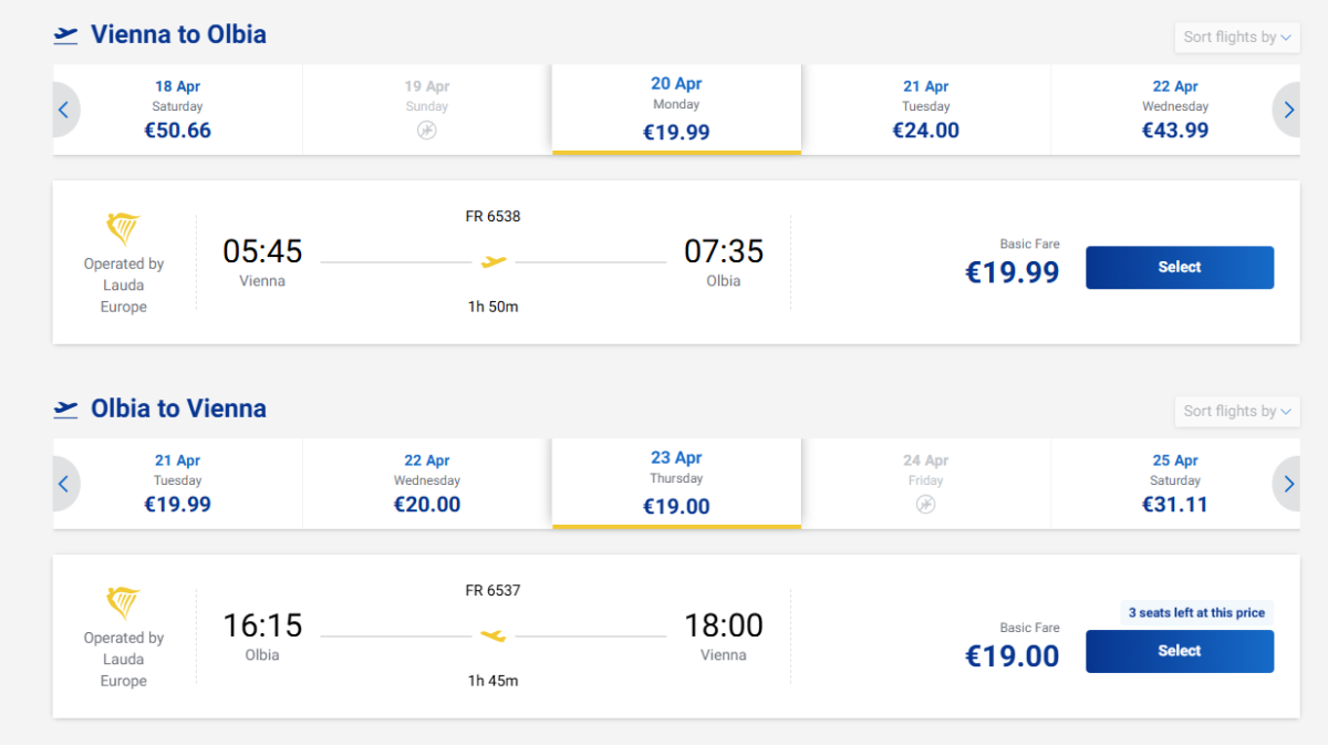 In spring, Ryanair's seasonal flights from Vienna to Olbia offer great deals on flights to Sardinia. In April you can buy return tickets from 39 eur.