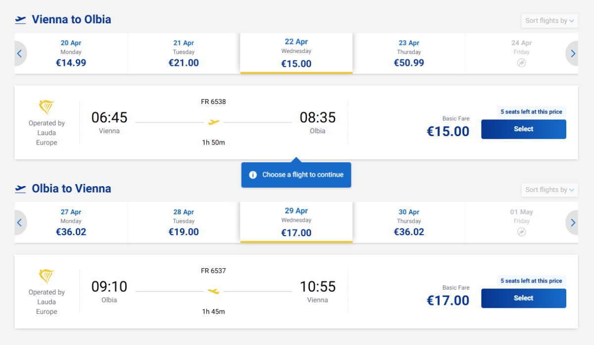 Ryanair offers cheap flights from Vienna to Sardinia, an island famous for its beautiful beaches like the Costa Smeralda and clear azure sea. Return flights to Olbia are available in April from just €32.