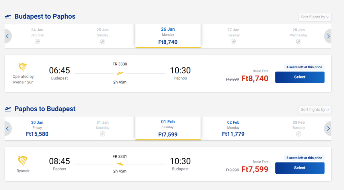 Low-cost airline Ryanair offers round-trip flights from Budapest to Paphos during the winter at reasonable prices. The cheapest dates are mainly in February, but good prices around 24 000 huf also appear in January or early March.