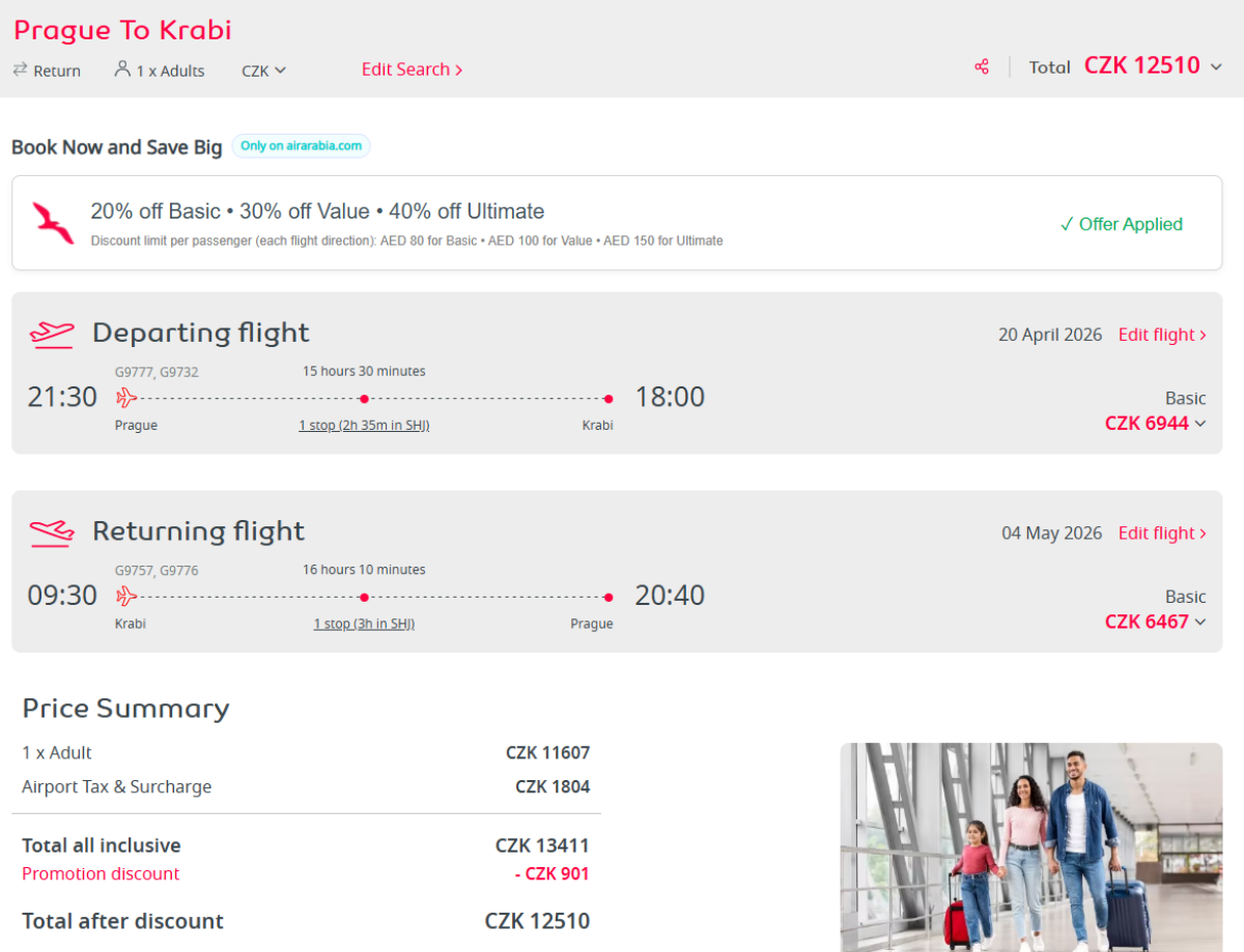 Take advantage of Air Arabia's promotion on return tickets from Prague to Krabi, Thailand. You can travel between 25 March and 15 June 2026.