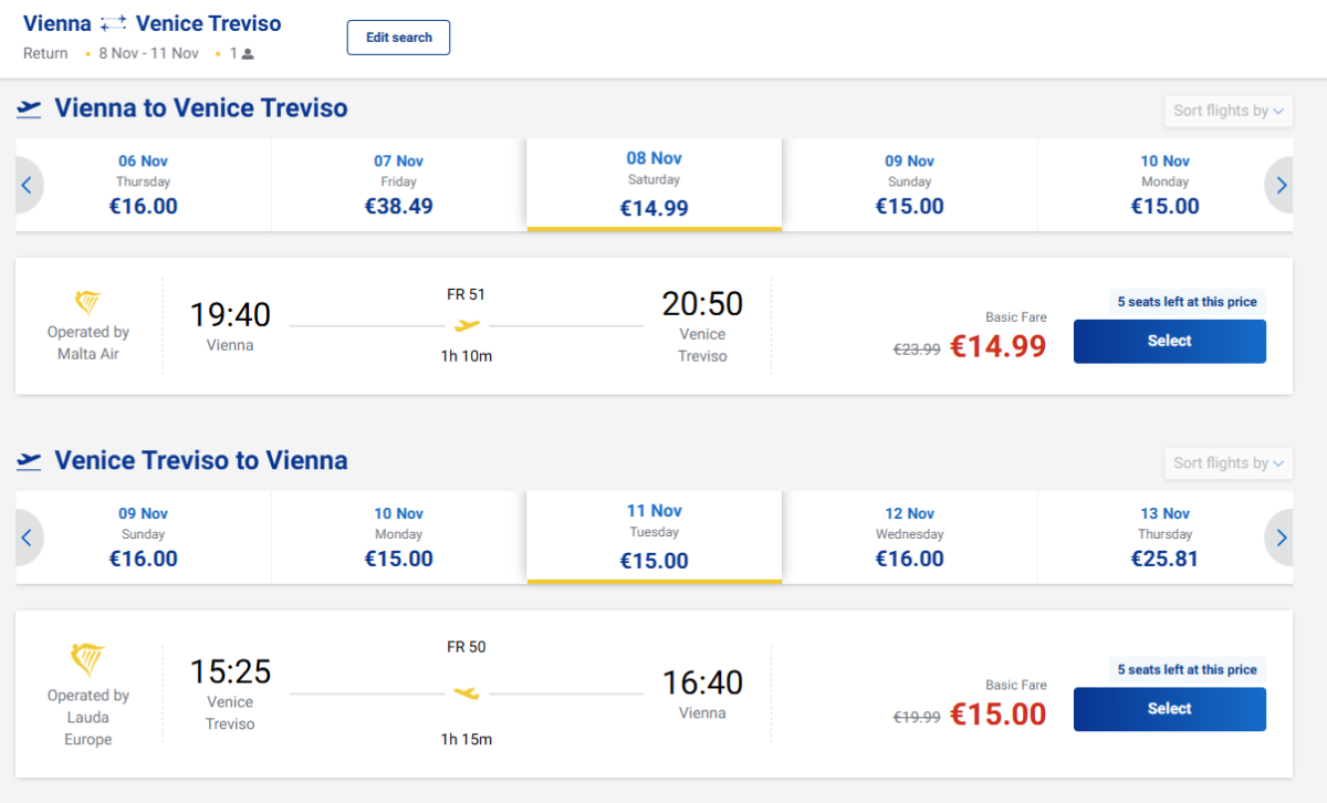 Ryanair offers cheap return tickets from Vienna to Venice for 30 eur for a number of dates in November and December.