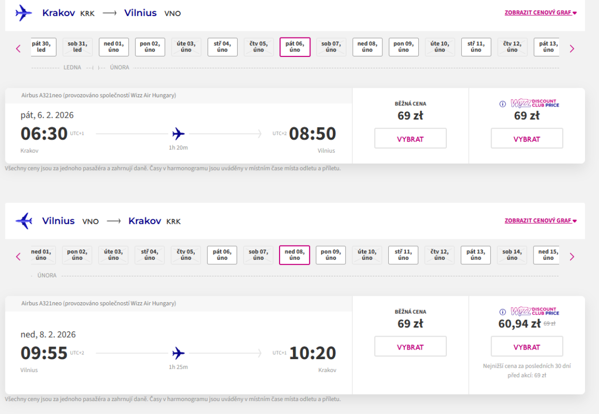Round-trip tickets from Krakow to Vilnius with Wizz Air for 138 pln, with WDC for 122 pln.