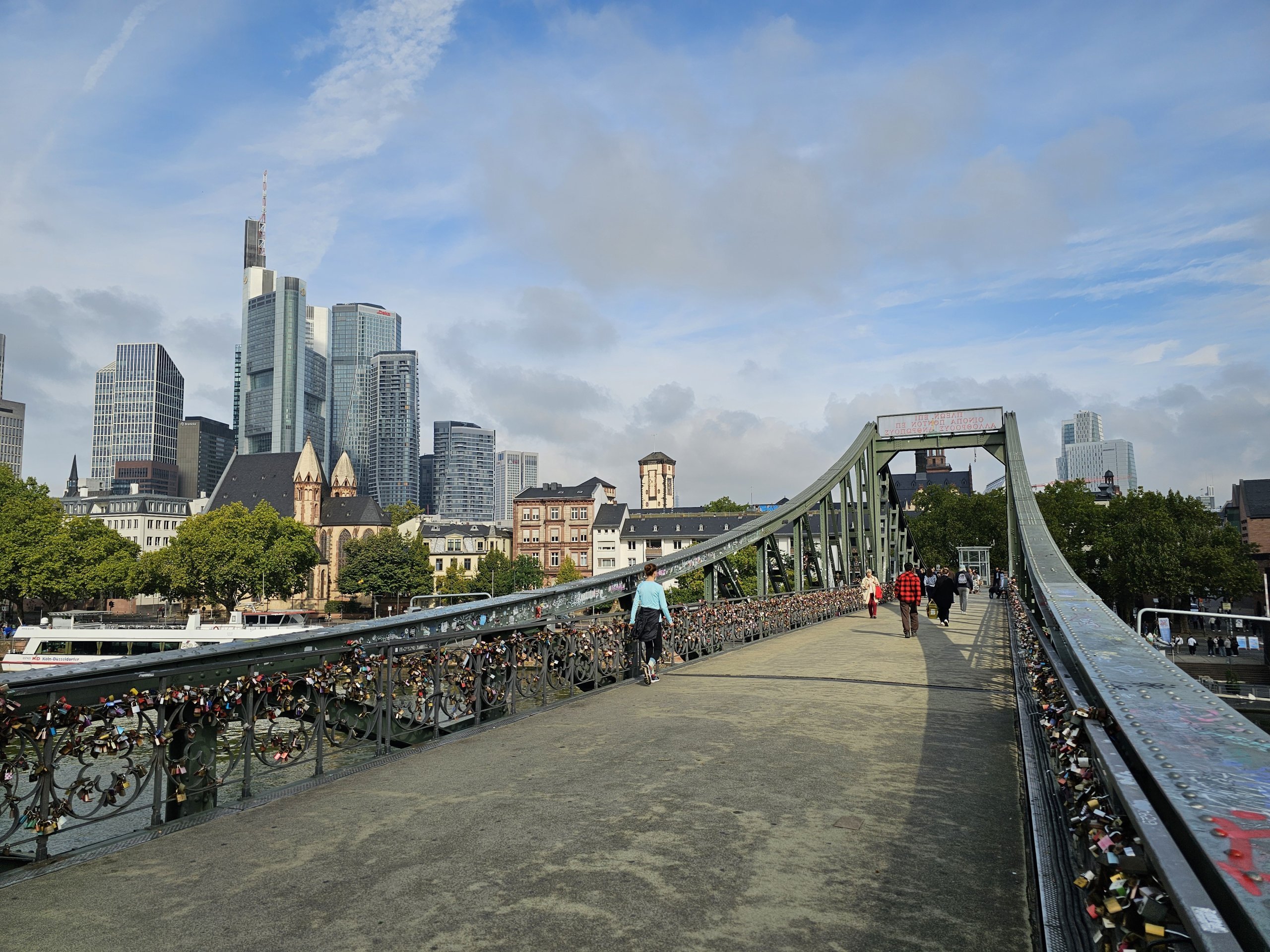 The Eiserner Steg is a historic pedestrian bridge leading from Römerberg Square over the Main River to the southern part of Frankfurt.