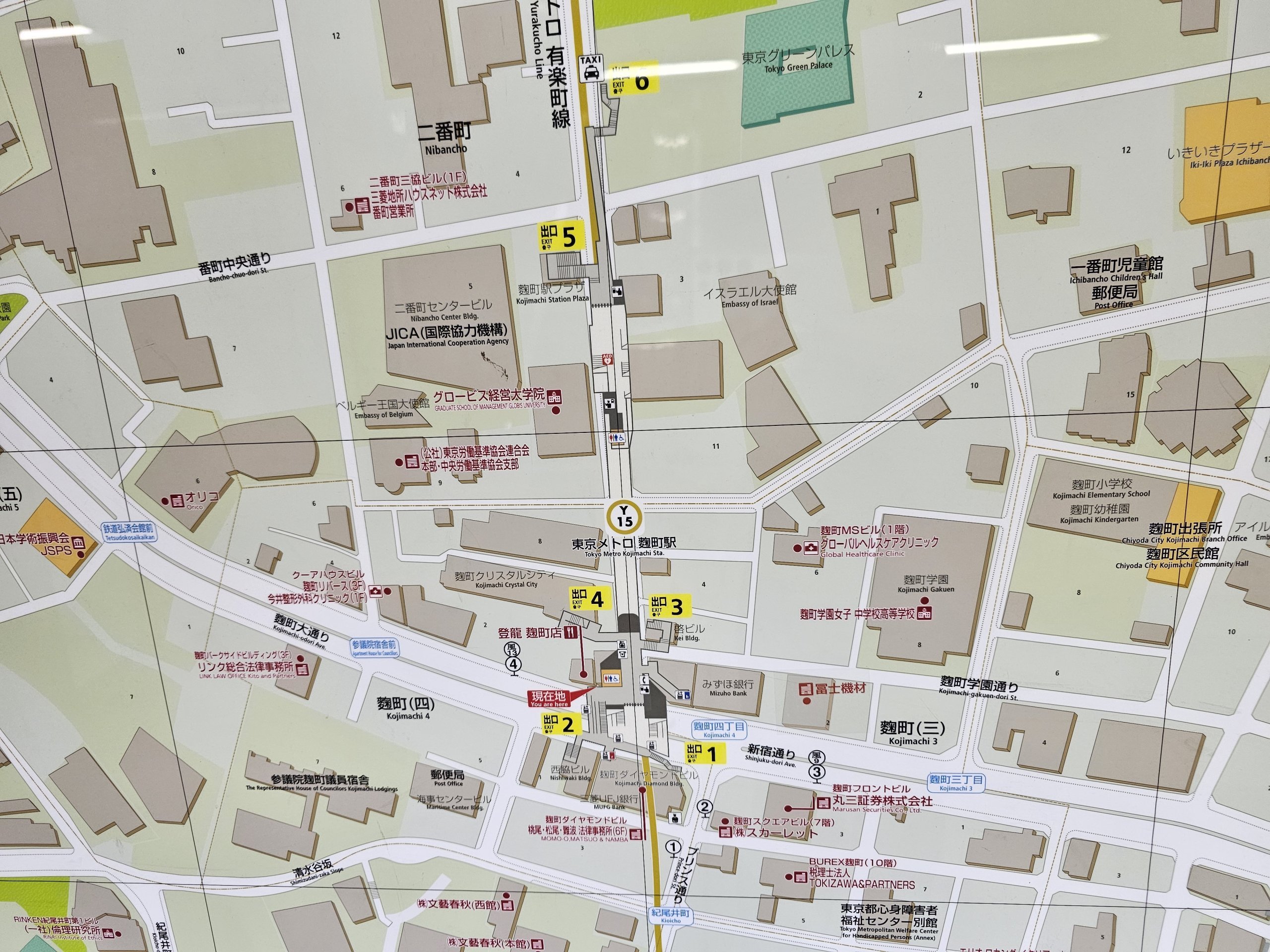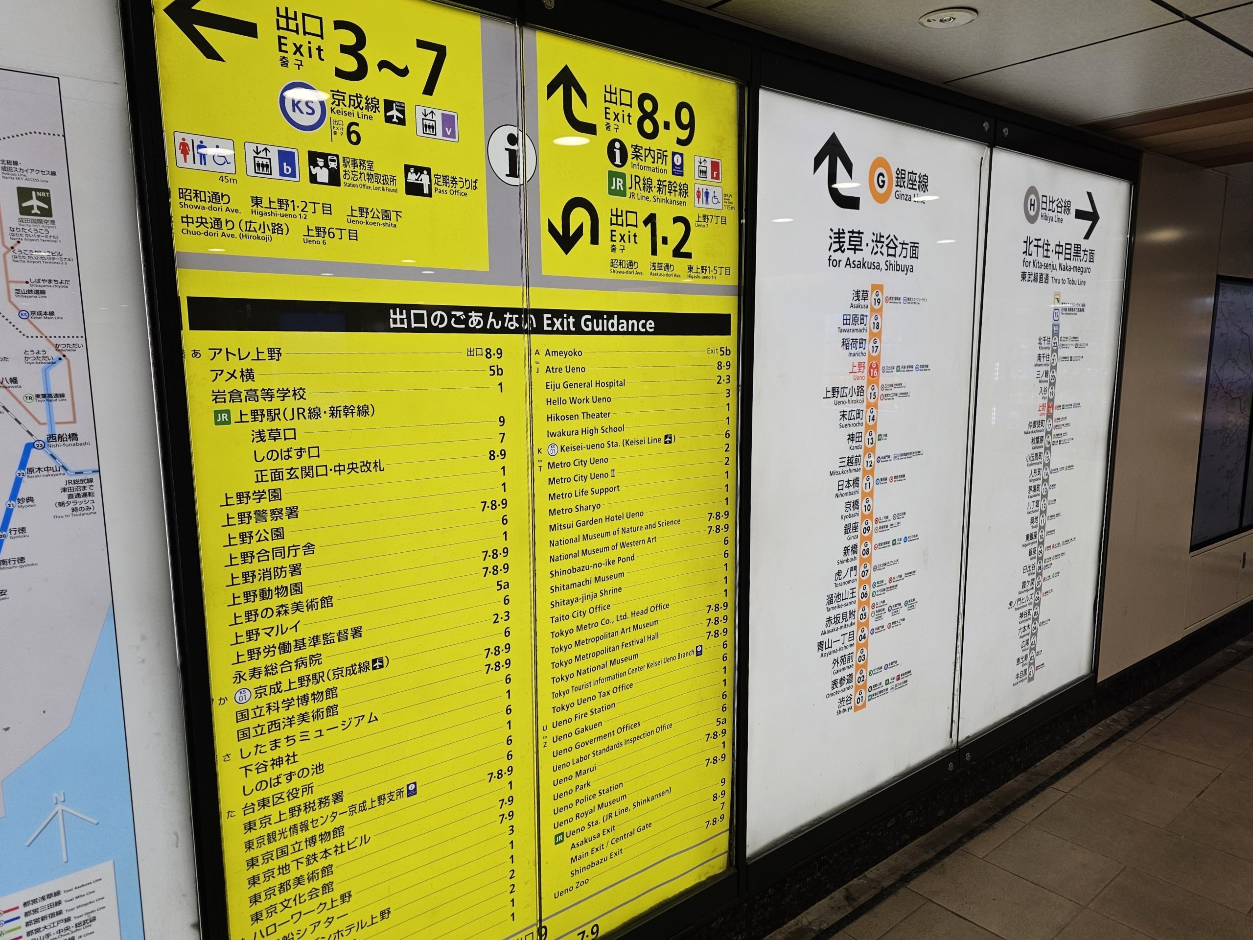 The map always has the different exits from the station marked in letters. These letters are then clearly marked in yellow throughout the station area.