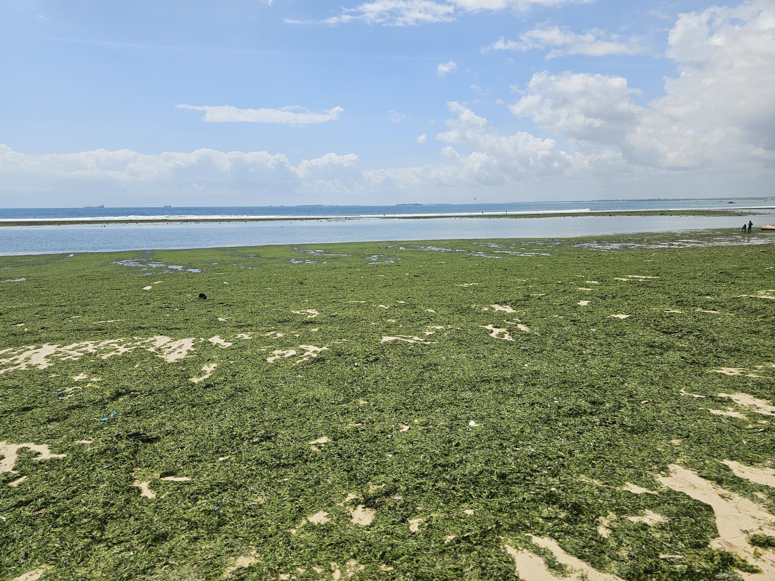 The water recedes up to 500 metres from the shore, revealing a huge amount of smelly algae.