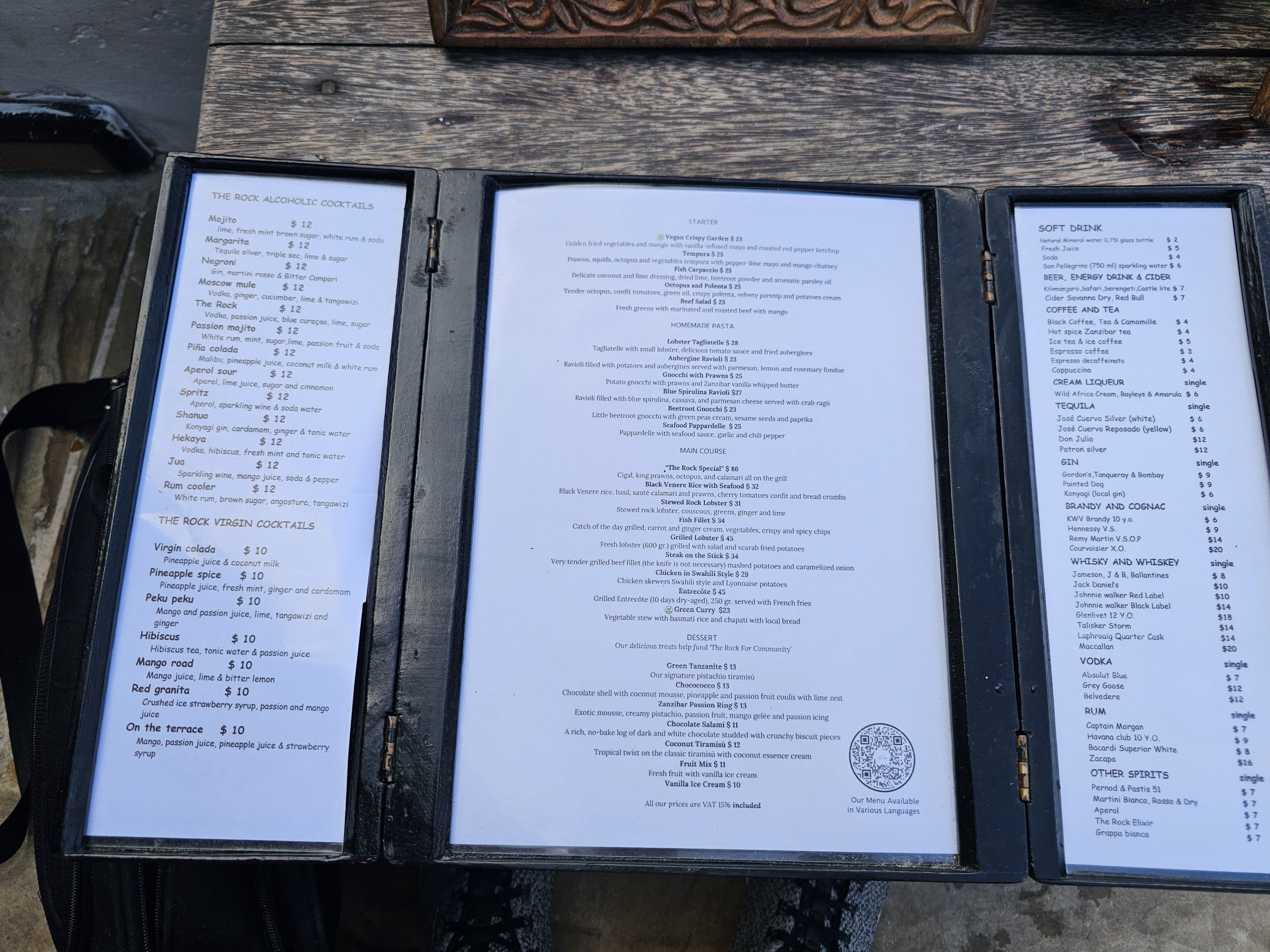 The full menu can be viewed on the restaurant's website: therockrestaurantzanzibar.com.