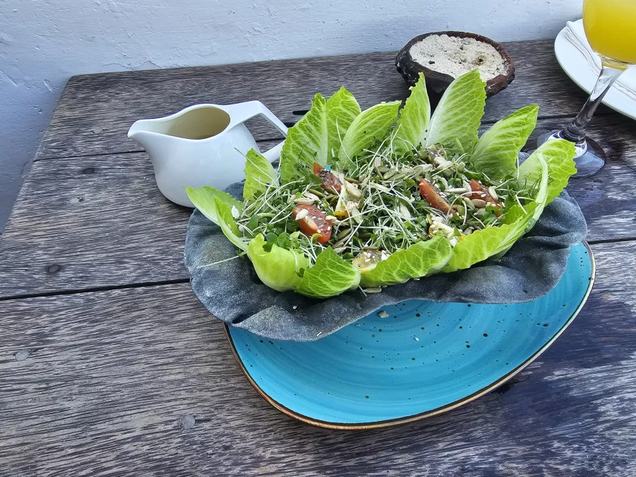 For an appetizer, I chose a local signature salad with sesame seeds and bread. It was great!
