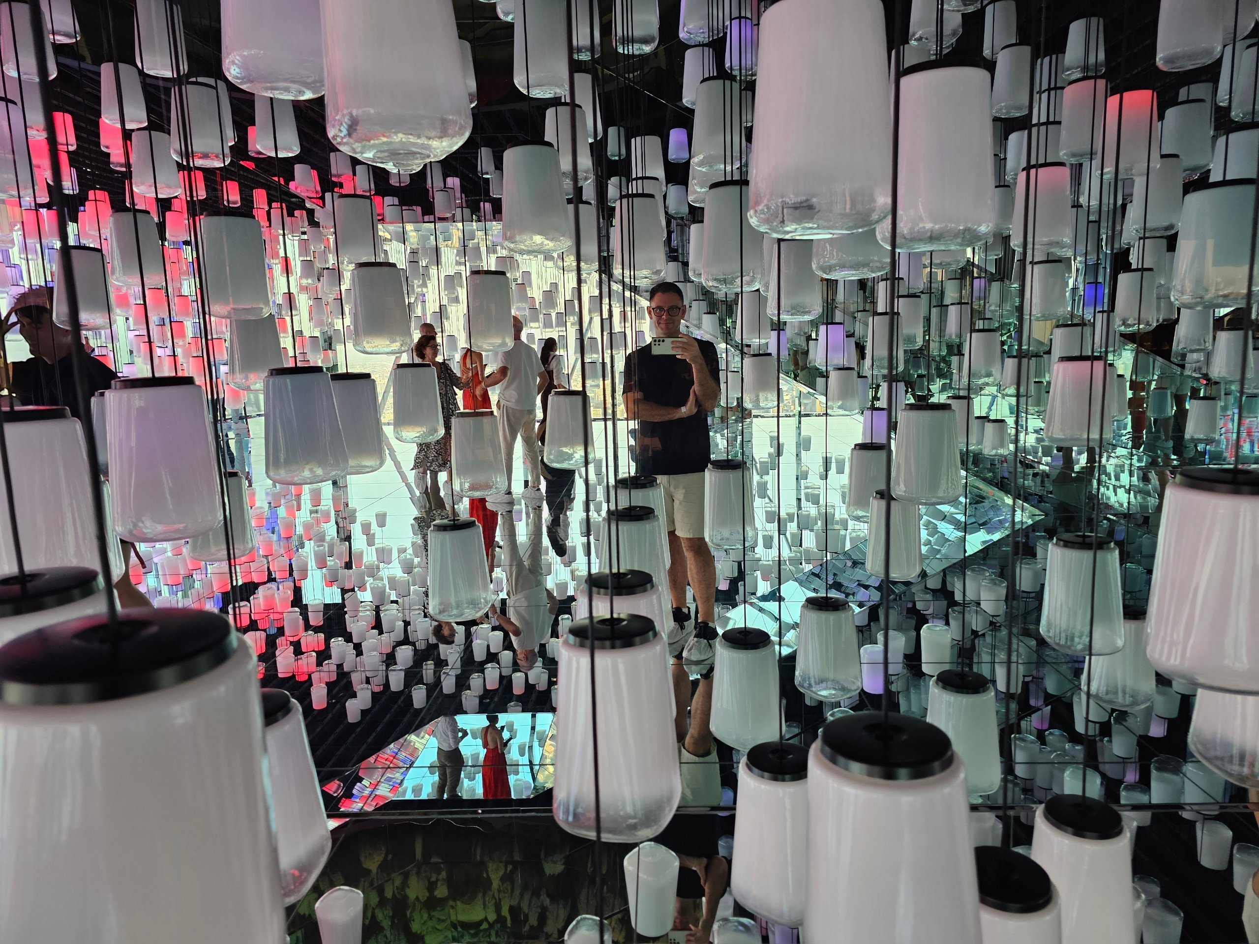 A two-level mirrored observatory with 360° views, where the people and the city in the background are beautifully reflected.