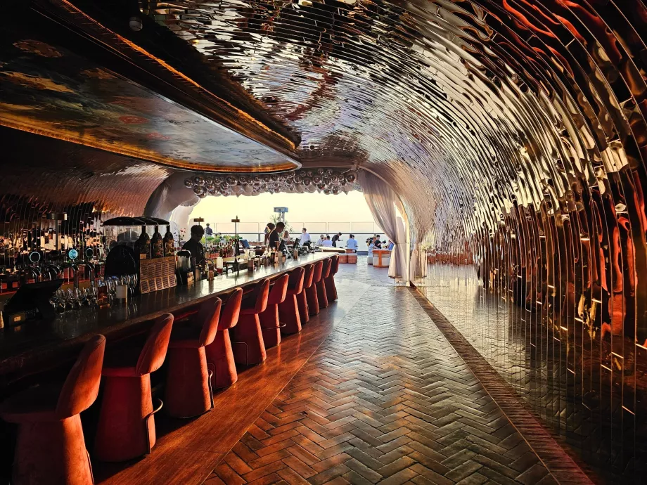 The space is livelier, music is playing and the terrace feels more like a lounge or party place. The view is already fully nocturnal and the installations stand out more than during the day.