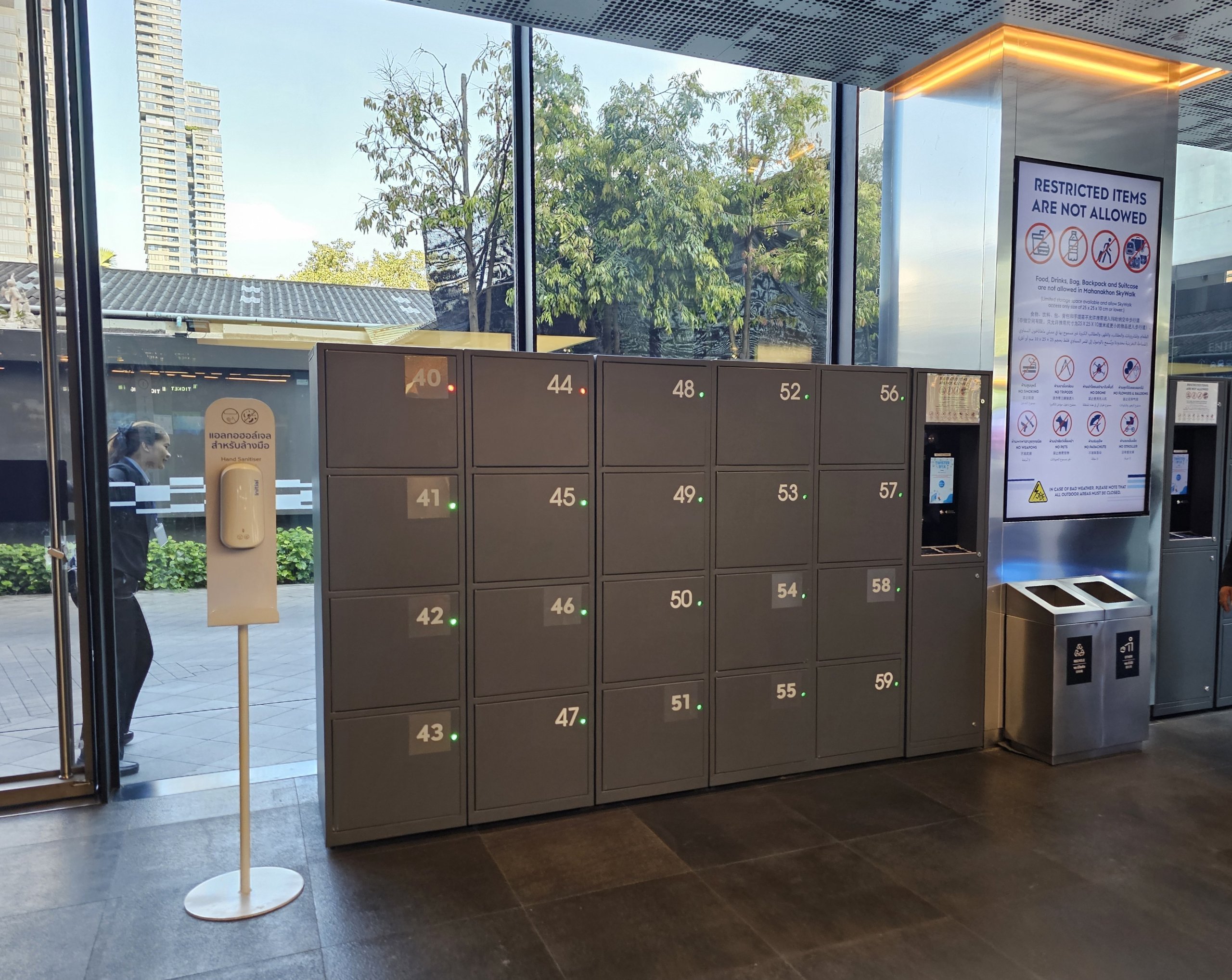 Air-conditioned lobby with panoramic windows. Good in rain or extreme heat.