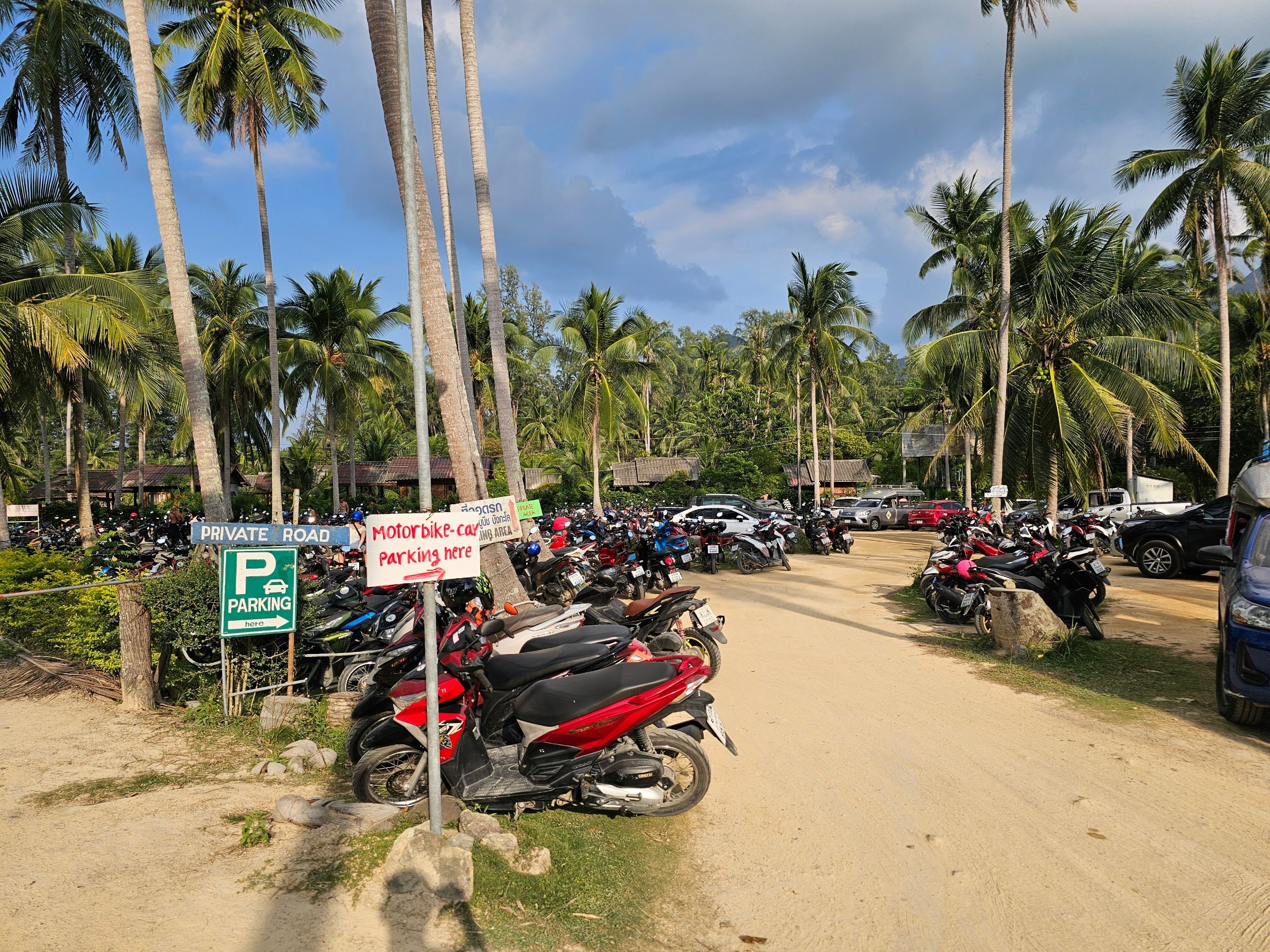 Parking is easy - for scooters right by the beach. For cars only along the main road (there are plenty of spaces). In both cases parking is free.