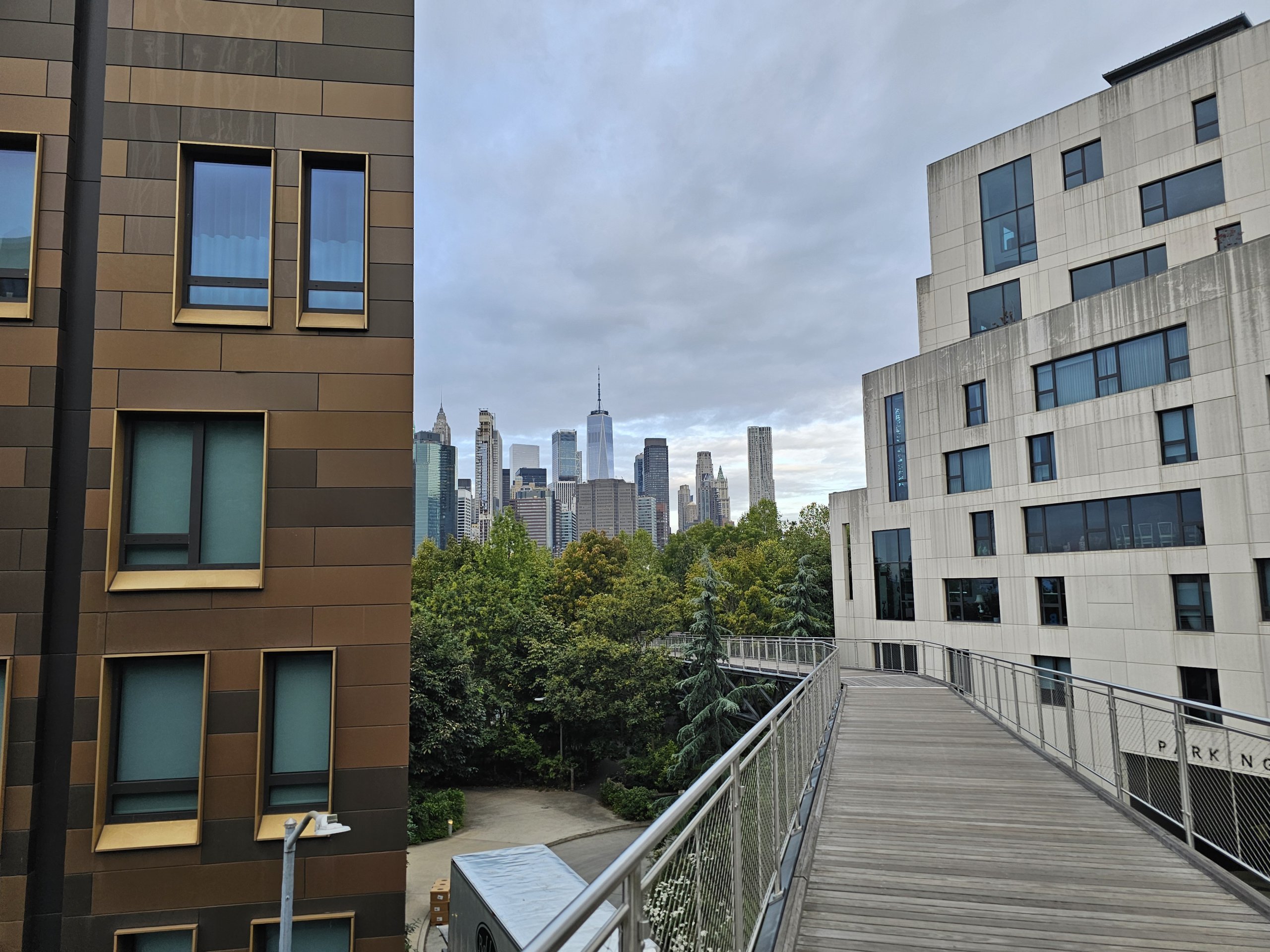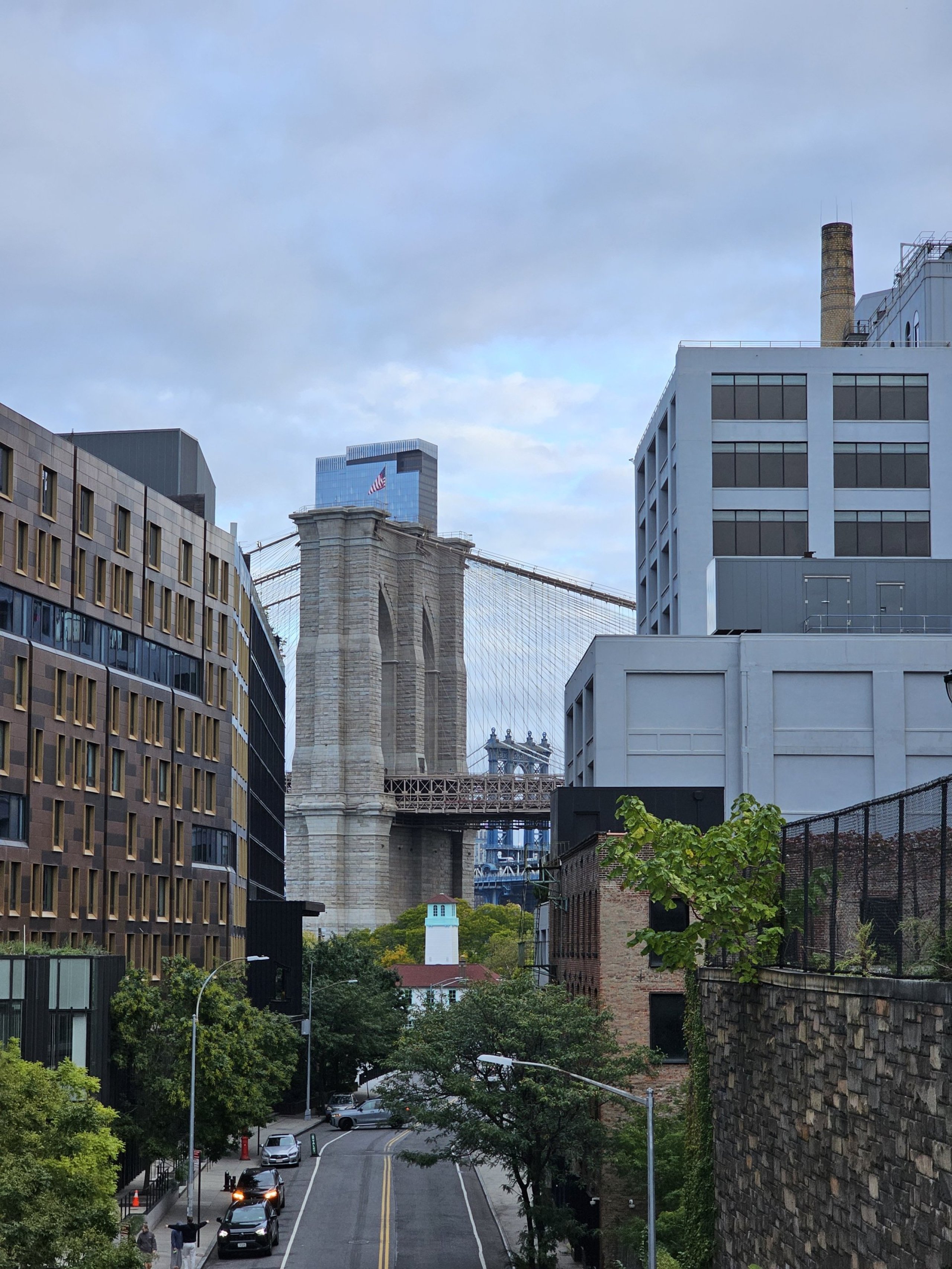 Interesting views not only of distant Manhattan, but also of one of the Brooklyn Bridge pylons, can be seen from the short pedestrian bridge in Squibb Park, which is directly adjacent to Brooklyn Bridge Park.