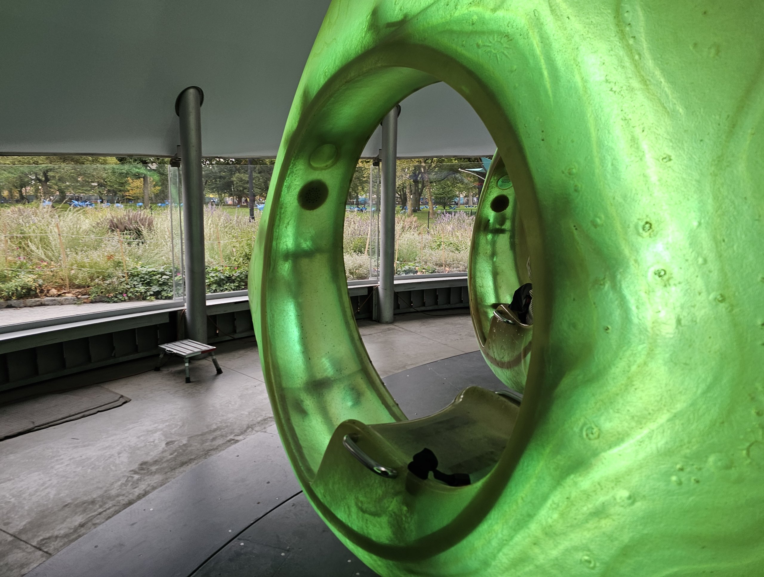 The SeaGlass Design Carousel is located in Battery Park in southern Manhattan near the Statue of Liberty boat dock.