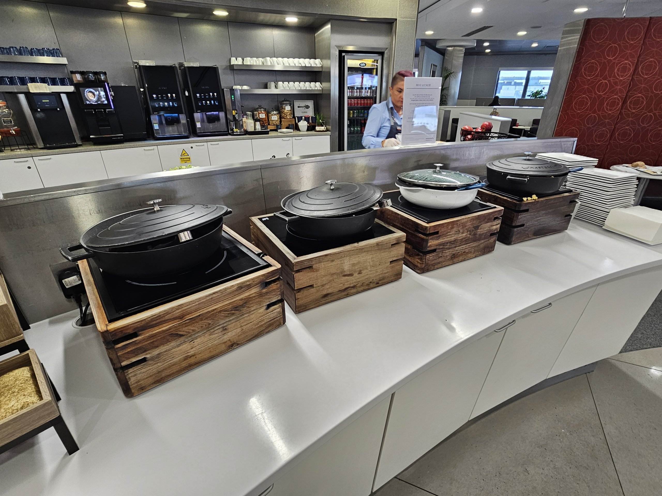 The hot food has a breakfast menu (until about 11:30am) and a lunch menu (until lounge closing time). Soup is available throughout the day.